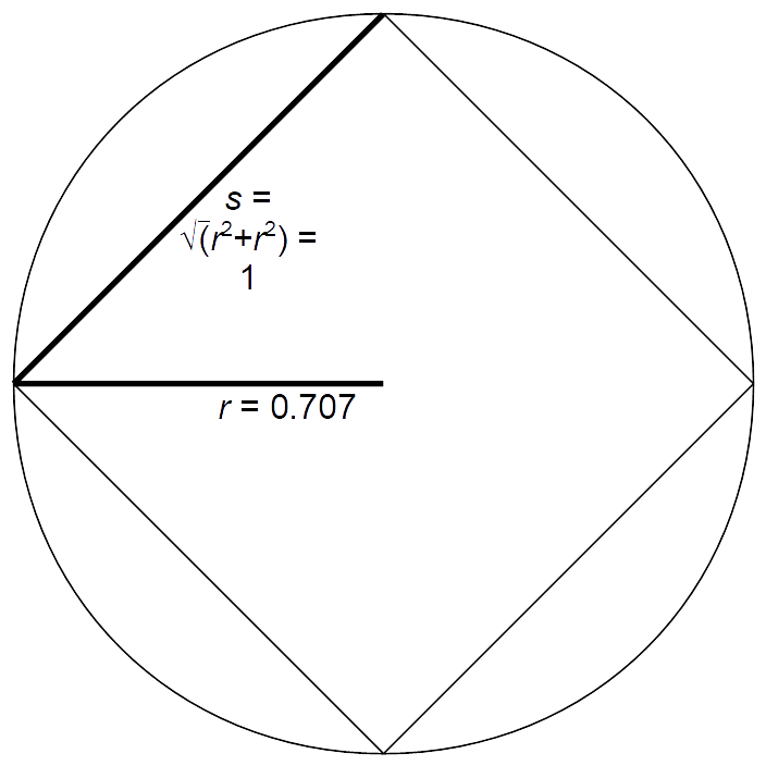 반지름을 두 배로 연장하면 지름 ''d''를 얻는다. 즉, 다음과 같은 관계가 있다.[12]