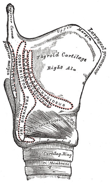 미주신경의 가지인 위후두신경이 분포하는 유일한 후두의 근육이다.[8][9] 다른 후두의 자체기원근육들에는 되돌이후두신경이 분포한다. 반지방패근은 상후두 신경의 외부 가지(미주 신경의 가지)에 의해 지배된다.[3][4]2. 2. 구성