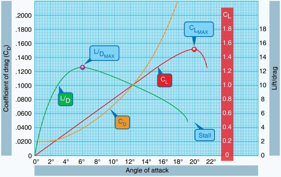 고정익기의 양력 계수는 받음각에 따라 달라진다. 받음각이 커짐에 따라 양력 계수는 최대 양력 계수에 다다를 때까지 함께 커지다가 그 뒤로는 줄어든다. 고정익 항공기에서는 받음각이 커질수록 날개 윗면에서 경계층이 분리되려는 현상이 강해지고, 이에 따라 양력 계수가 커지는 속도가 점점 줄어들게 된다.[7]