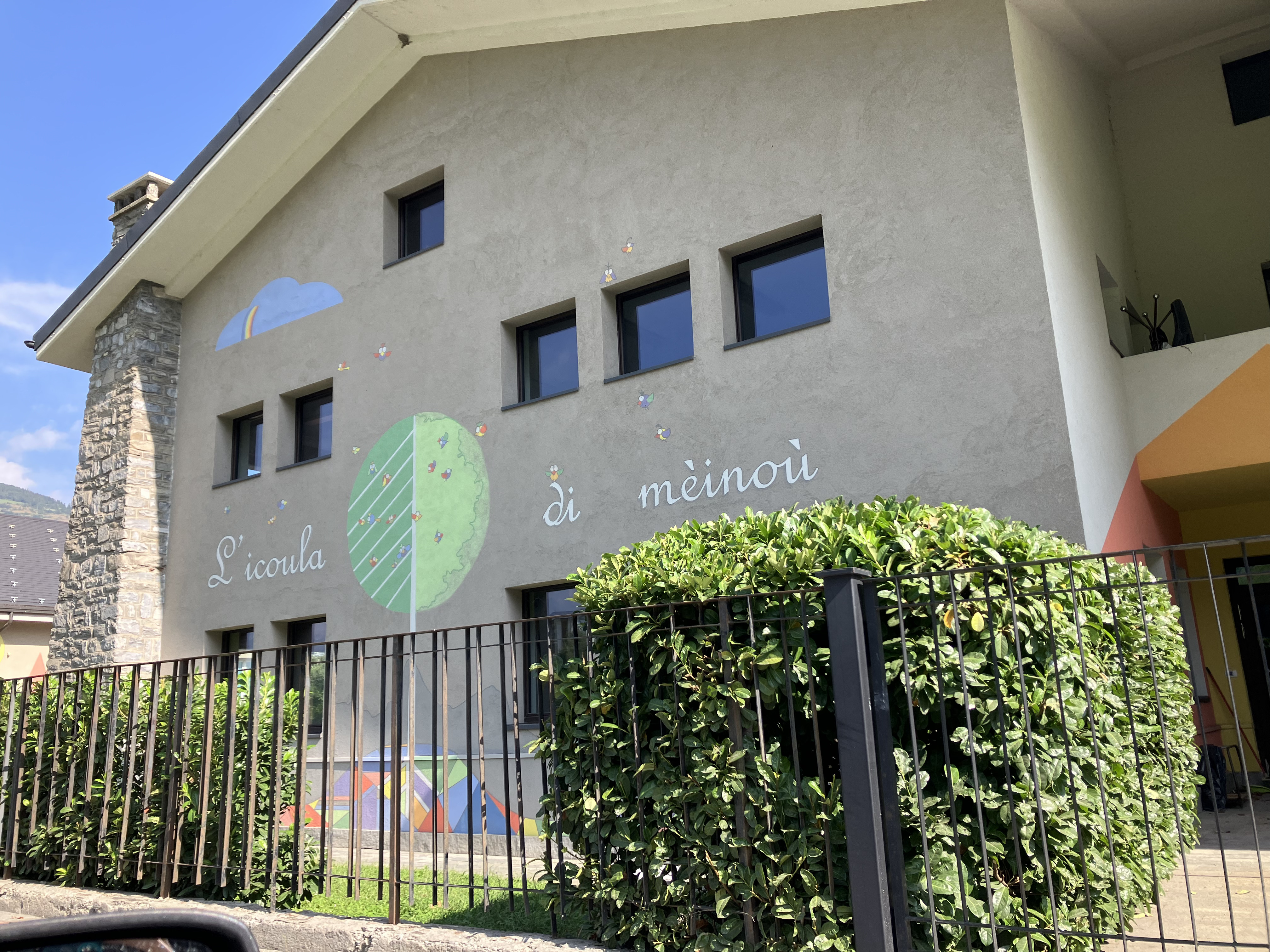 샤르방소 플랑-펠리나즈에 있는 초등학교 표지판("L'icoula di mèinoù", "어린이 학교"라는 뜻) ''발도탱'' 표지판
