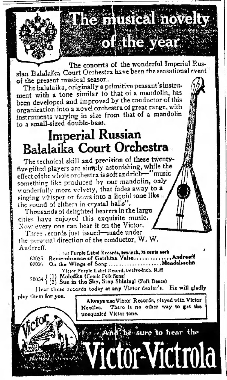 바실리 안드레예프의 노력 덕분에 차르 러시아 시대에 오케스트라 민속 전통이 확립되었고, 이는 나중에 소련 내에서 하나의 운동으로 성장했다.[20] 완전한 형태의 발랄라이카 오케스트라는 발랄라이카, 돔라, 구슬리, 바얀, 블라디미르 셰퍼드 호른, 가르모시카, 그리고 여러 종류의 타악기로 구성된다.
