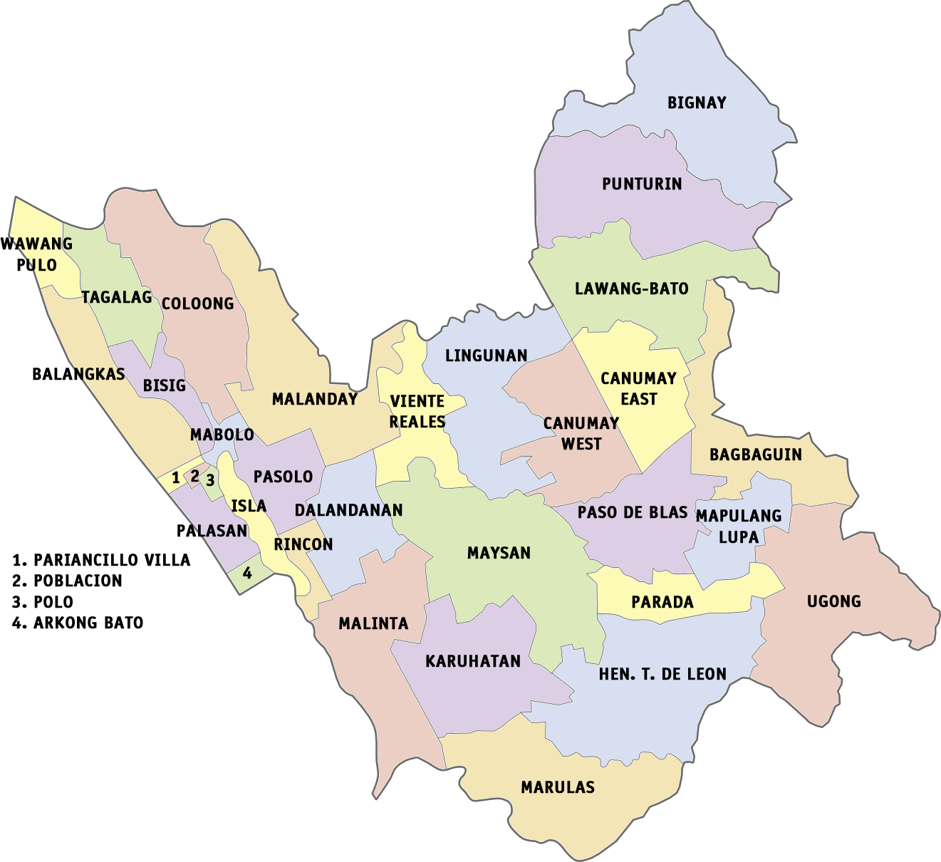1960년 7월 21일, 카를로스 P. 가르시아 대통령은 행정 명령 제401호에 서명하여 폴로를 폴로와 발렌수엘라로 나누었다.[32] 폴로는 와왕 풀로, 포블라시온, 팔라산, 아르콩 바토, 파리안실로 빌라, 발랑카스, 마볼로, 콜롱, 말란데이, 비시그, 타갈라그, 린콘, 파솔로, 푼투린, 비그나이, 비엔테 레알레스, 달라난다를 포함했다. 반면 발렌수엘라는 카루하탄, 마룰라스, 말린타, 우공, 마풀랑 루파, 카누마이, 메이산, 파라다, 파소 데 블라스, 바그바귄, 토레스 부갈론(현재는 제너럴 T. 데 레온)의 남쪽 바랑가이를 포함했다. 임시 타운 홀은 오늘날의 SM 시티 발렌수엘라 맞은편에 세워졌고, 영구 타운 홀은 맥아더 하이웨이와 옛 폴로-노발리체스 로드의 교차로 근처에 건설되었다.