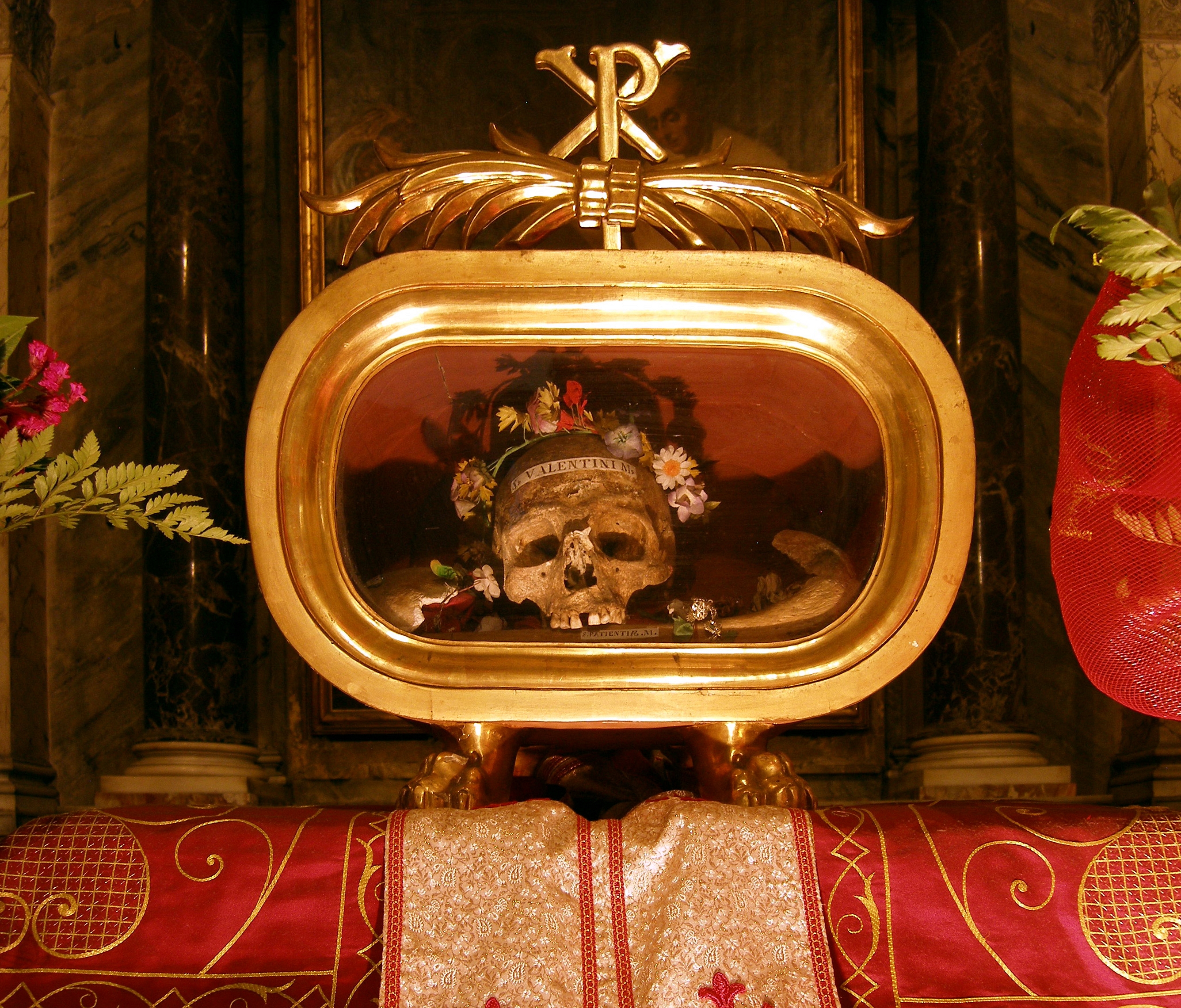 꽃으로 장식된 성 발렌타인의 것으로 추정되는 두개골은 로마의 산타 마리아 인 코스메딘 바실리카에 전시되어 있다.