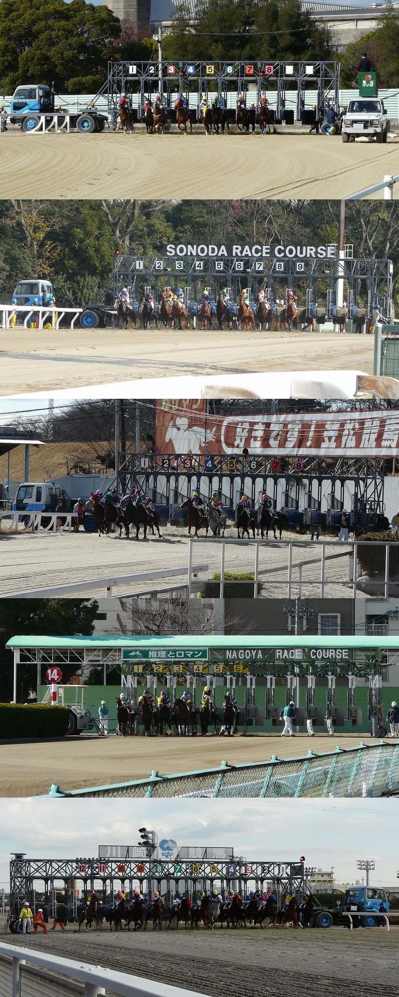 중앙 경마에서는 1960년 고쿠라 경마장에서 처음으로 게이트식 출발대가 도입되었다.[11] 초기에는 뉴질랜드 경마에서 사용되던 우드식을 참고하여, 일본중앙경마회 (NCK→JRA)와 노자와구미의 기술자들이 개발한 게이트가 사용되었다.[23] 파이프를 조합한 형태의 문이 열리는 방식이었고, 4개 틀로 1단위를 구성하여 조합하는 방식이었다. 고무 동력이 사용되어 가볍고 운반이 쉬우며 잔디를 덜 상하게 하는 장점이 있었지만, 발밑에 파이프가 있어 말이 걸려 넘어지기 쉽고, 가벼워서 말이 날뛰면 게이트가 움직이는 등 문제점이 있었다.