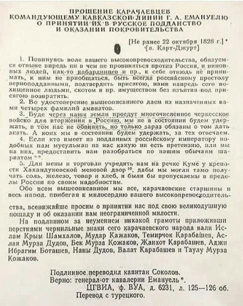 REPORT OF THE COMMANDER OF THE SEPARATE CAUCASIAN CORPS OF THE CITY OF C ROSEN TO THE MINISTER OF WAR A. I. CHERNYSHEV ABOUT THE NEGOTIATIONS OF PRINCE I. C SHAKHOVSKY AND KARACHAYS ABOUT THE RESUMPTION OF THE OATH OF ALLEGIANCE TO RUSSIA
