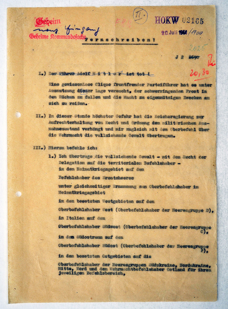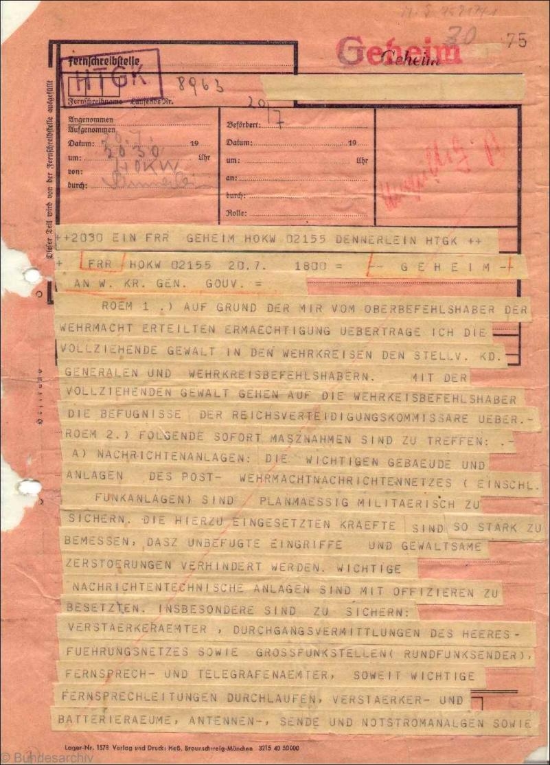 7월 20일에 전달되었지만 완전히 실행되지 않은 명령은 계획의 범위와 세부 사항, 그리고 군사적 및 정치적 목표를 모두 보여준다. 즉, SS와 SD의 무장 해제, 그리고 음모자들이 나치 정권의 무법 상태라고 생각하는 것에서 정부 및 군사적 행동의 방향 전환이다.