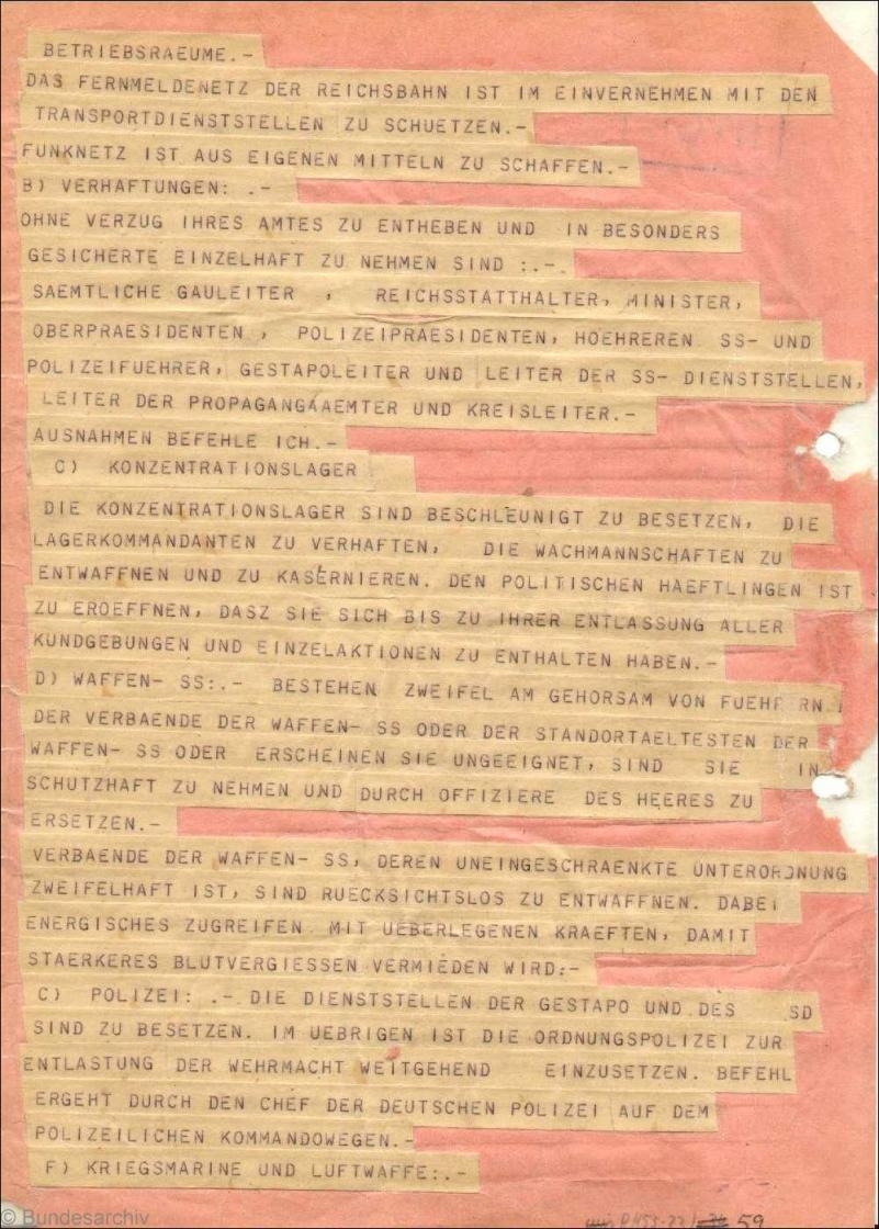 - 체포: 모든 지역 지도자, 제국 부관, 장관, 총독, 경찰 위원, 상급 SS 및 경찰 수장, 게슈타포 지도자 및 SS 부서 지도자, 선전 사무소 지도자 및 지역 지도자들을 즉시 직무에서 해임하고 독방에 격리해야 했다.[3]