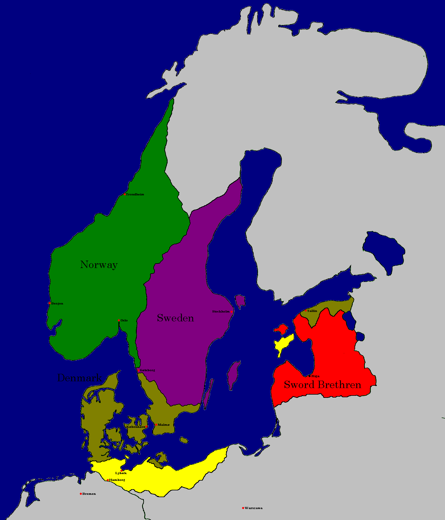 13세기에 들어서면서 그동안 주로 북해 쪽에 주목했던 덴마크 왕국이 발트해 연안 지역으로 진출하여 한때 이 지역의 패권을 장악했다. 정복왕이라고도 불리는 발데마르 2세 시대에는 홀슈타인, 메클렌부르크, 폼머른, 그리고 바다를 건너 에스토니아까지 정복하여 발트해를 한때 덴마크의 내해로 만들었다. 그러나 1223년 슈베린 백작 하인리히에 의해 발데마르 2세가 포로가 되어, 석방 조건으로 많은 해외 영토를 상실했다. 그리고 잃어버린 땅을 되찾으려고 1227년 북독일 제후들과 뤼벡과 싸웠지만 이것에도 패했다. 그러나 덴마크는 이후에도 발트해의 강국으로 존재했고, 마침내 신흥 한자 동맹과 충돌하게 되었다. 1340년 덴마크 왕에 발데마르 4세가 즉위하자, 에스토니아를 독일 기사단에게 매각하고, 이 자금으로 지배 체제를 강화했다. 국내를 안정시키자 1361년 한자의 중심 도시 중 하나였던 갓트란드 섬의 비스뷔를 점령하고 한자 동맹과 전쟁 상태에 들어갔다. 그러나 이 전쟁은 초반에는 덴마크 측이 우세했지만, 마침내 주변 국가들의 지원도 얻은 한자 측이 우세해져, 1370년 슈트랄준트 조약에서 한자의 승리가 확정되었고, 이에 따라 발트해는 한자의 제해권 하에 완전히 들어가게 되었다. 또한, 이 전쟁을 통해 발트해 측과 북해 측 한자 도시들의 연계가 성립되었고,[108], 한자 동맹은 전성기를 맞게 되었다.