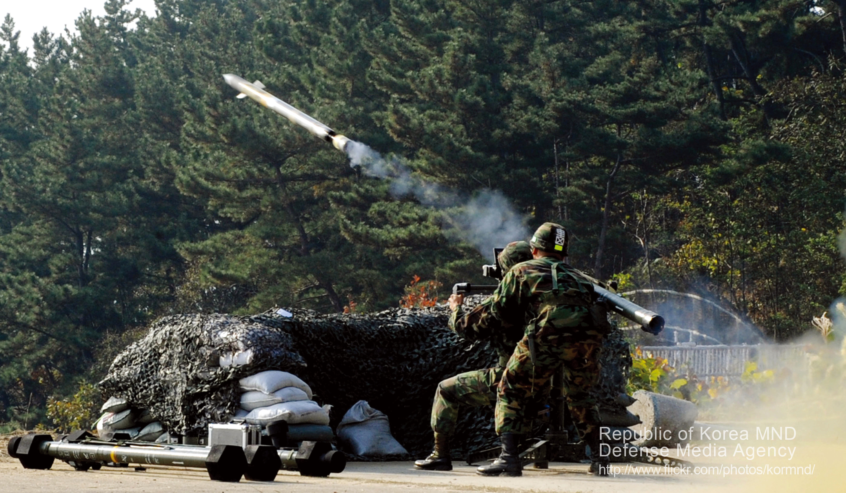 - '''미스트랄'''은 프랑스에서 도입한 휴대용 지대공 미사일이다. 대한민국 육군 방공의 대표적인 휴대용 지대공 유도무기로, 지상에 발사대를 설치하고 발사하는 방식이다. 적외선 추적 방식과 목표가 2m 이내에 들어오면 자폭하는 근접신관을 사용하여 높은 정확성을 보인다.[13] 유효사거리는 5.5km(최대사거리 7km)이고 탄두는 2.95kg이다. 공대공 및 함대공 미사일로도 사용 가능하다. 울산급 호위함과 포항급 초계함에서도 대공방어용으로 미스트랄을 배치하기도 했다.