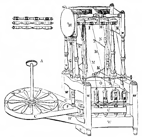 1740년대까지 모든 방적은 방적기를 사용하여 수작업으로 이루어졌다. 영국의 최첨단 방적기는 저지 방적기(Jersey wheel)로 알려져 있었지만, 대안적인 방적기인 삭소니 방적기(Saxony wheel)는 두 개의 띠를 가진 발판 방적기로, 방추가 여행자보다 8:6의 비율로 더 빨리 회전하여 실을 뽑는 작업은 방적공의 손가락으로 이루어졌다.[3]