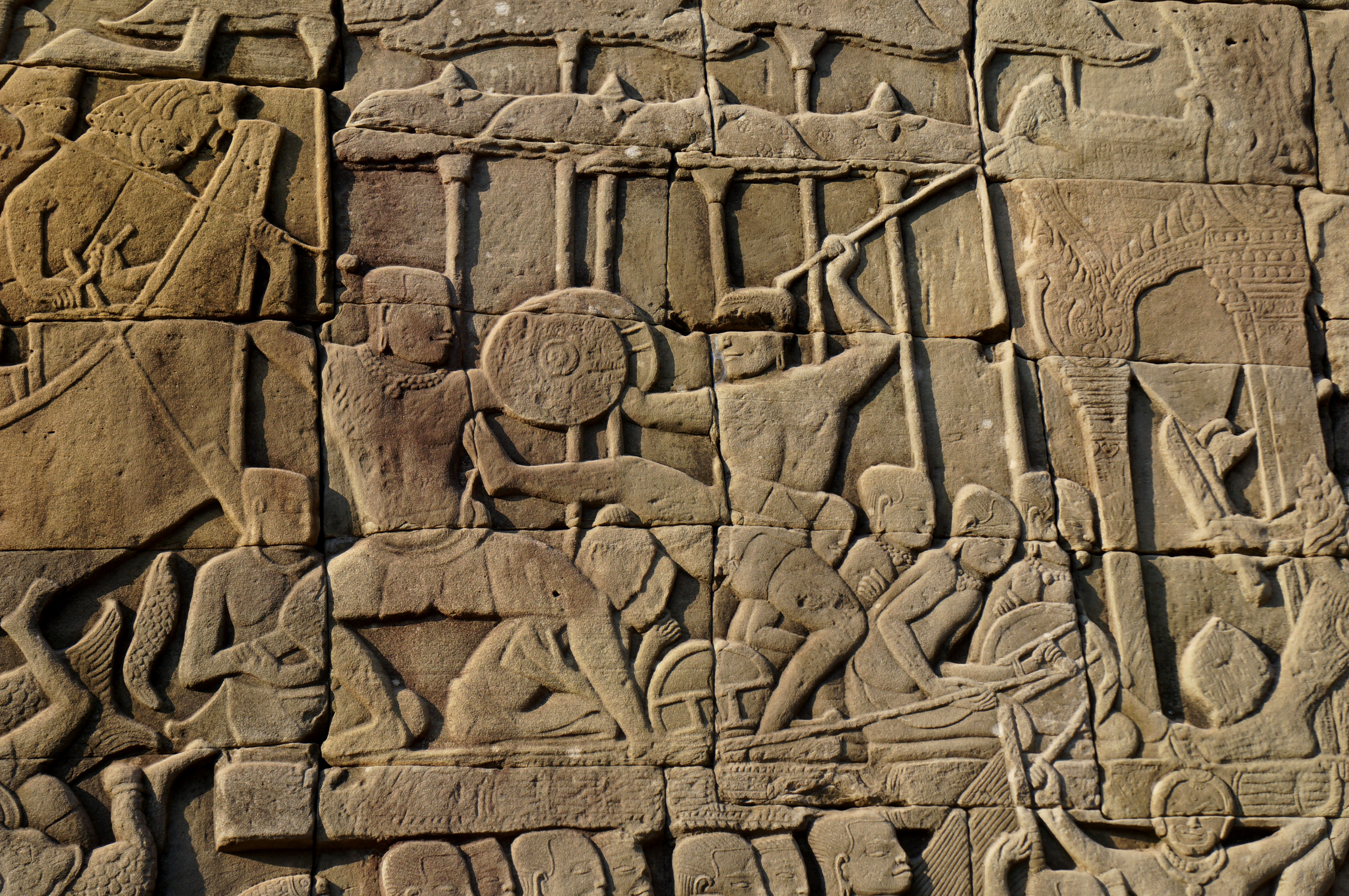 - 공격 및 제압: 단단함과 무게를 이용해 방패 면이나 모서리로 적을 가격하거나 밀치고, 돌격 시 충격을 주거나, 적의 공격을 흘리고 시야를 가리는 등 다용도로 활용되었다.[34]