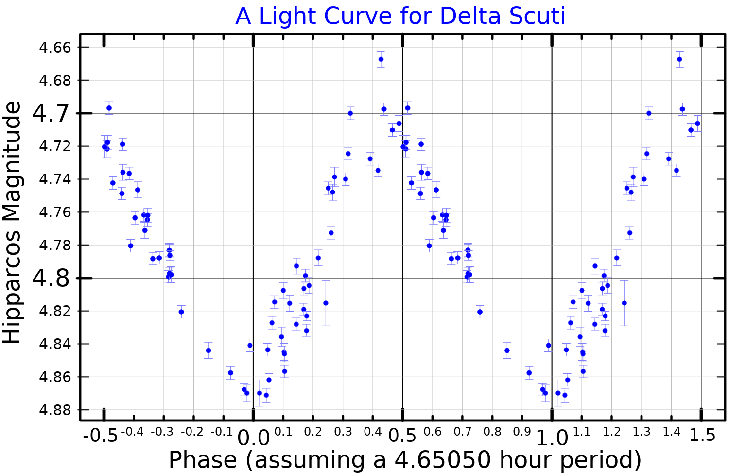 델타 방패자리의 변광성은 1900년 리크 천문대의 윌리엄 W. 캠벨과 윌리엄 H. 라이트가 밀스 분광기를 사용하여 시선 속도 변화를 관측하면서 처음 발견되었다. 1935년, 아틸리오 콜라체비치는 주기의 시선 속도 변화와 약 0.2등급의 광도 변화를 확인하고, 이 변광성이 분광 쌍성에 의한 것이 아님을 밝혔다. 1938년에는 두 번째 주기가 발견되었고, 맥동 이론이 제안되었다. 이후 델타 방패자리는 여러 개의 개별적인 반경 방향 및 비반경 방향 모드로 맥동한다는 것이 밝혀졌다. 가장 강한 맥동 모드는 59.731 μHz의 주파수를 가지며, 총 8개의 서로 다른 주파수 모드가 모델링되어 있다.