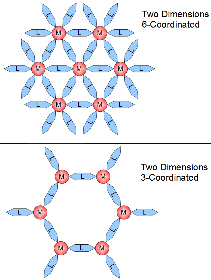 배위 고분자의 구조와 차원은 링커와 금속 중심의 배위 기하학에 따라 결정된다. 배위수는 대부분 2에서 10 사이이다.[6] 그림 2는 다양한 배위수의 예를 평면 기하학으로 보여준다. 1차원 구조는 2배위, 평면은 4배위, 3차원은 6배위이다.