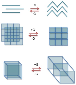 게스트 분자의 첨가 및 제거는 배위 고분자의 최종 구조에 큰 영향을 미칠 수 있다. (상단) 1차원 선형 사슬이 지그재그 패턴으로 변경, (중간) 2차원 시트가 엇갈린 구조에서 적층 구조로 변경, (하단) 3차원 입방체가 더 넓게 간격이 벌어지는 경우가 있다.