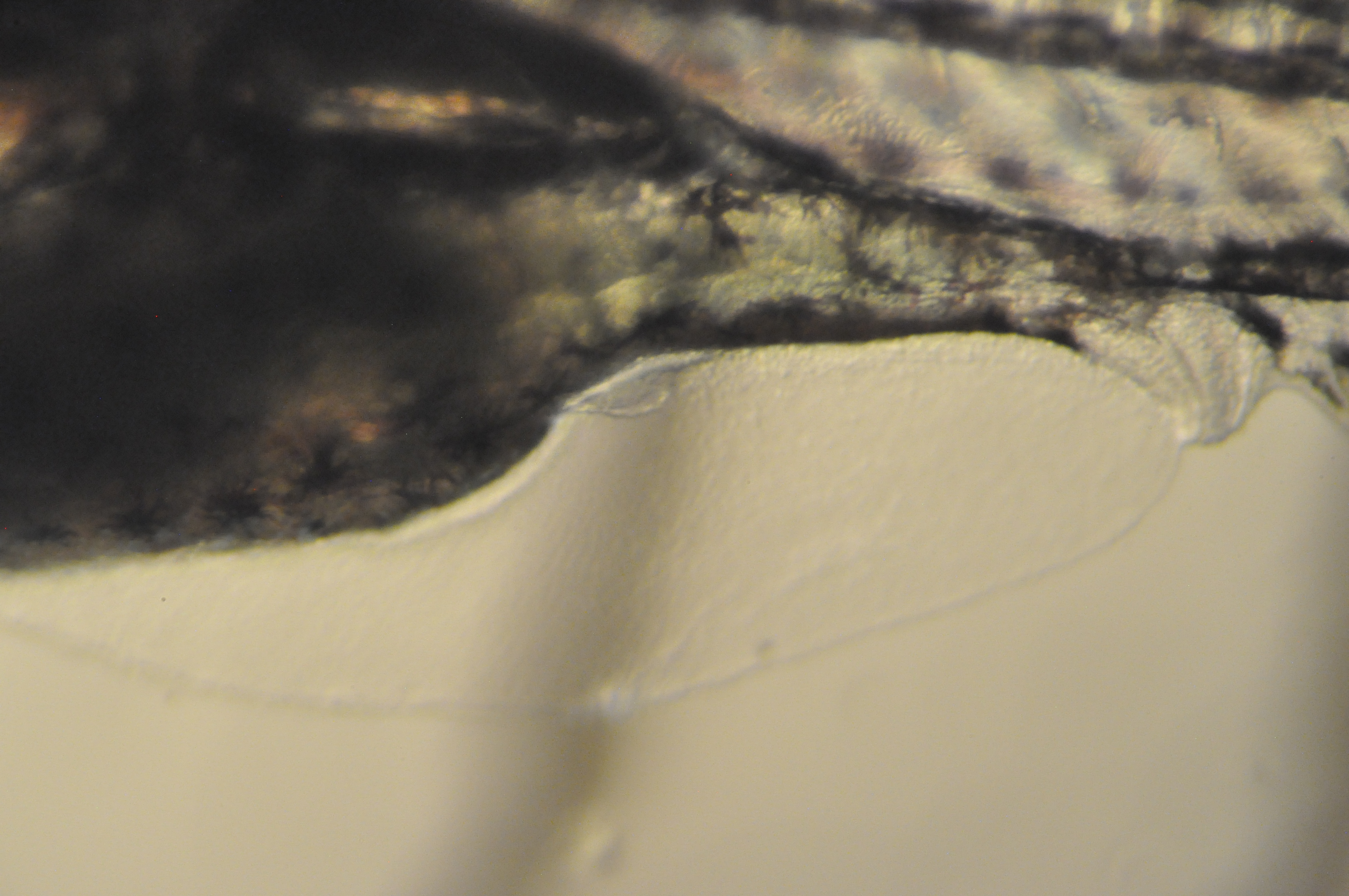 제브라피쉬에서 골반 지느러미 싹은 정점 외배엽 비후를 형성하는 간엽 응축으로 시작한다.[7] 이 비후에서 지느러미 주름이 형성되며, 이후 이동성 간엽이 침입하여 지느러미 싹을 근위 간엽(내골격대와 방사상 구조를 형성)과 원위 간엽(피부 지느러미 광선을 형성)으로 분리한다.[7]