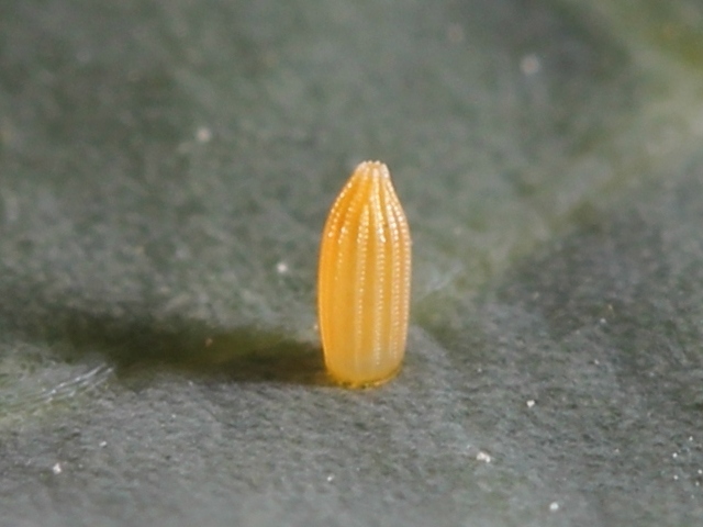 은 노란색을 띠며, 길이 약 1mm 정도의 불룩한 기둥 또는 병 모양이다. 표면에는 12개의 세로줄이 있는 것이 특징이다.[12] 알은 약 1주일 만에 부화한다.