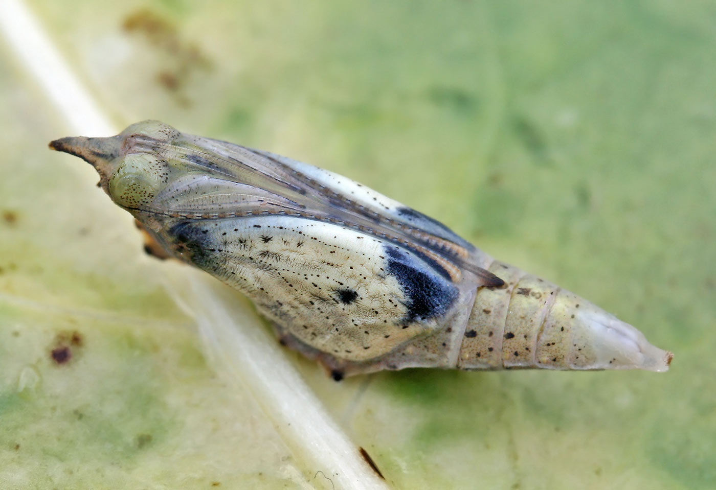 다 자란 애벌레는 식물의 잎 뒷면이나 그 근처에서 번데기가 된다. 따뜻한 시기에는 부화 후 약 2주 만에 번데기가 될 준비를 하며, 이 기간 동안 4번 탈피하여 몸길이가 약 4cm까지 자란다. 번데기가 되기 직전의 애벌레는 적합한 장소를 찾아 부산하게 움직인다. 알맞은 장소를 찾으면 벽면 등에 실 덩어리를 토해 꼬리 부분을 고정하고 거꾸로 매달린 다음, 머리를 등 쪽으로 구부리면서 가슴 부분을 고정하는 실띠를 토한다. 이렇게 몸을 고정한 후 마지막 탈피를 하여 번데기가 된다.