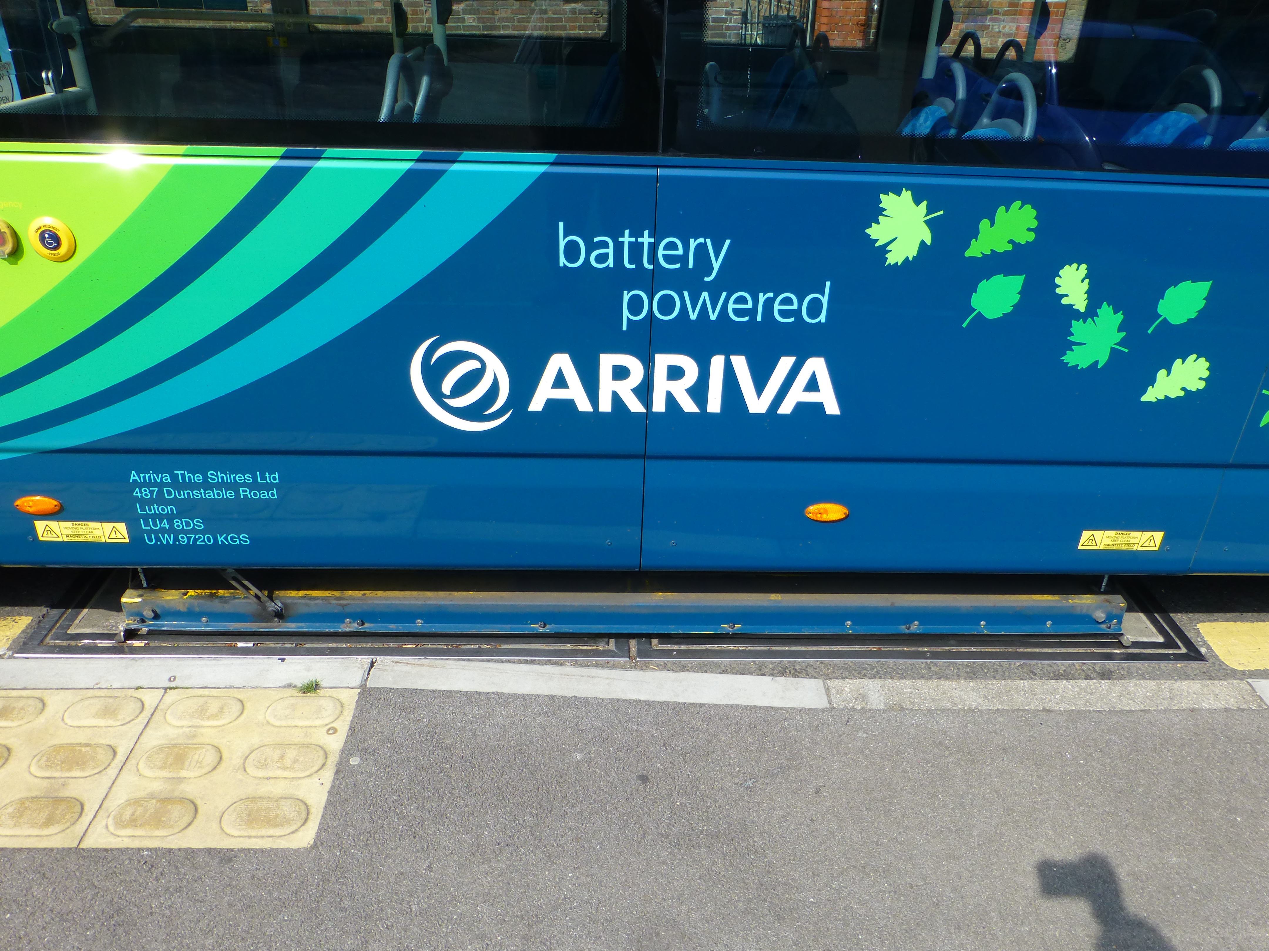 Arriva Shires & Essex의 Wright StreetLite EV 버스가 버스 정류장에서 유도를 사용하여 배터리를 충전하고 있다.