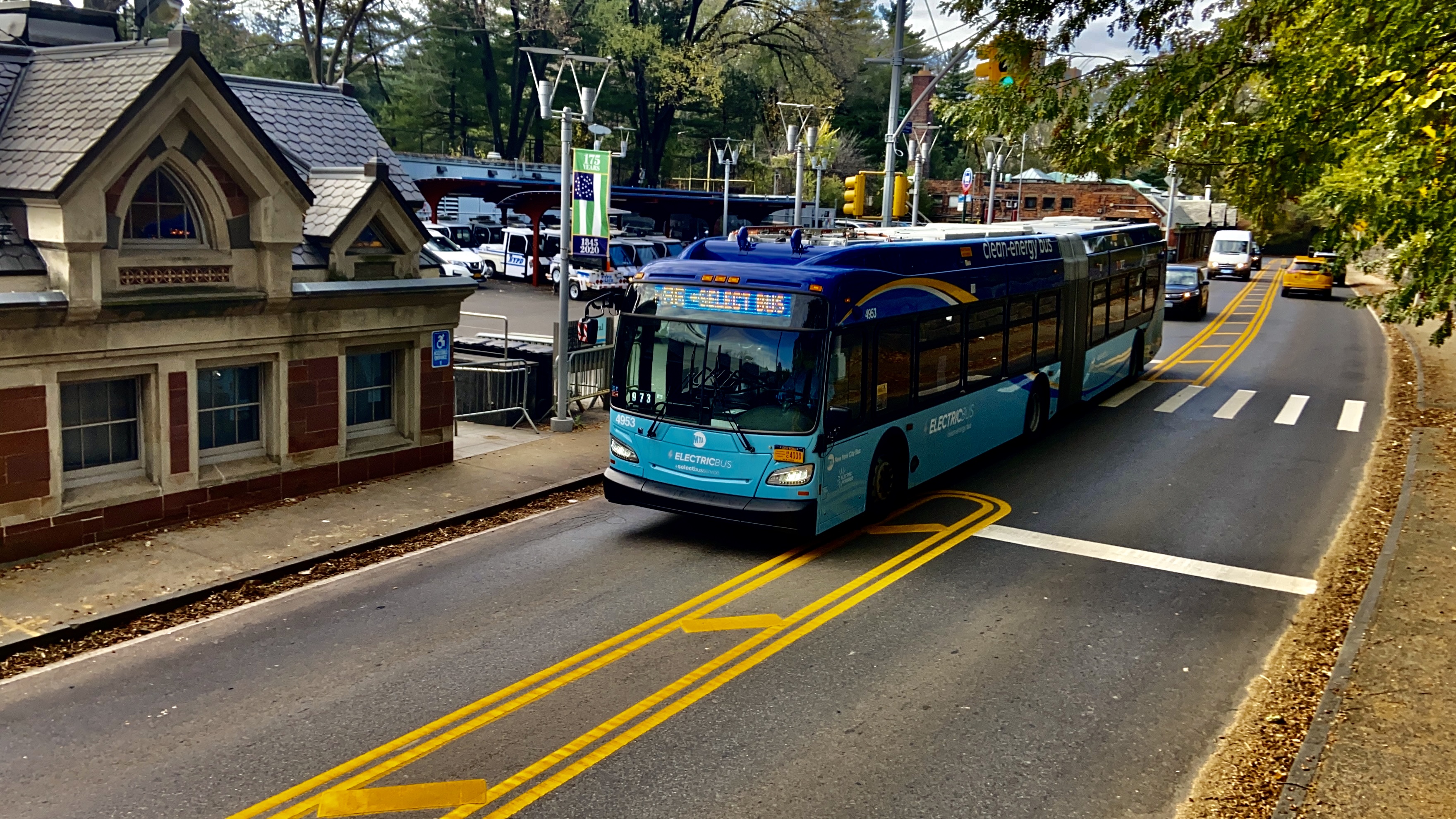 뉴 플라이어(New Flyer) 엑셀시오 XE60 CHARGE 굴절 전기 버스가 뉴욕 시에 있다.