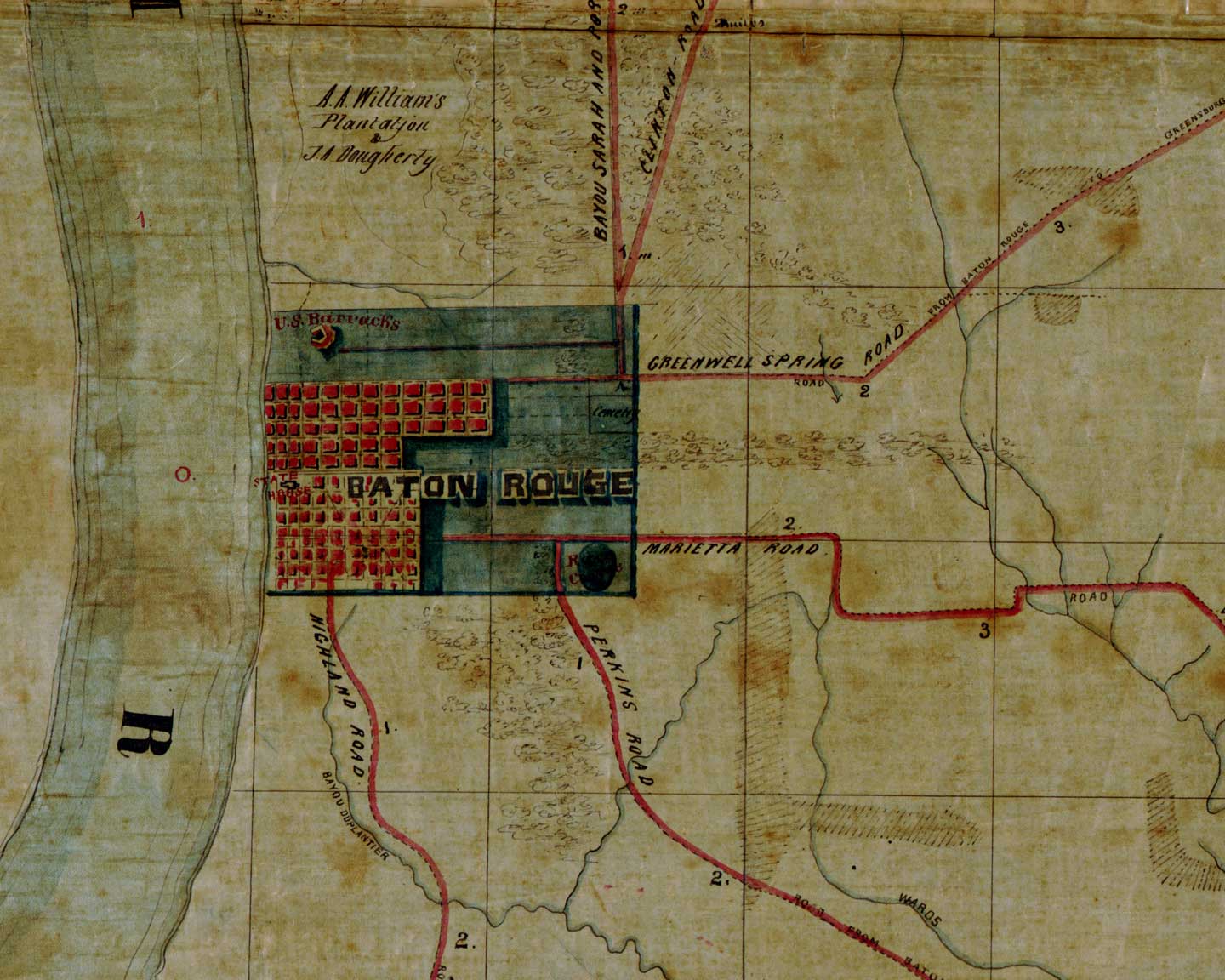 미국 남북 전쟁이 발발할 무렵, 배턴루지의 인구는 거의 5,500명이었다. 전쟁은 1862년 봄에 시작되어 전쟁이 끝날 때까지 지속된 연방군의 도시 점령과 관련된 사업을 제외하고는 경제 발전을 거의 멈추게 했다. 남부연합군은 처음에 다른 곳에 병력을 집결시켰고, 그 동안 주 정부는 오펠루사스로, 나중에는 슈리브포트로 이동했다.[21] 1862년 여름, 존 C. 브레킨리지(전 미국 부통령)와 다니엘 러글스 장군이 이끄는 약 2,600명의 남부연합군이 배턴루지를 탈환하려고 시도했다.