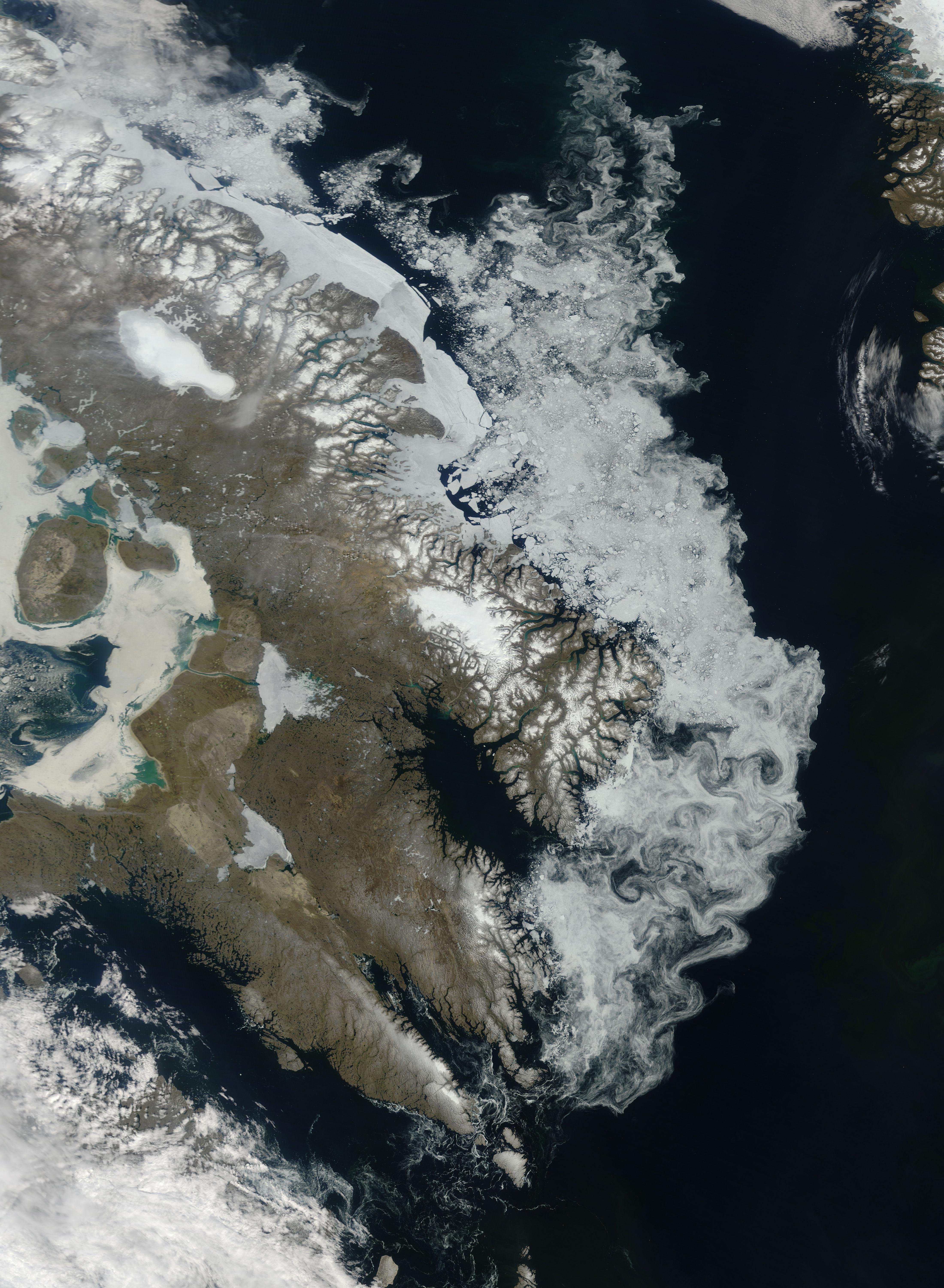 해빙은 일년 중 대부분 기간 동안 섬 주변을 둘러싸고 있으며, 북쪽 해안에서 얼음이 완전히 사라지는 시기는 6월 중순부터 9월 말까지의 짧고 예측 불가능한 기간뿐이다.[83]