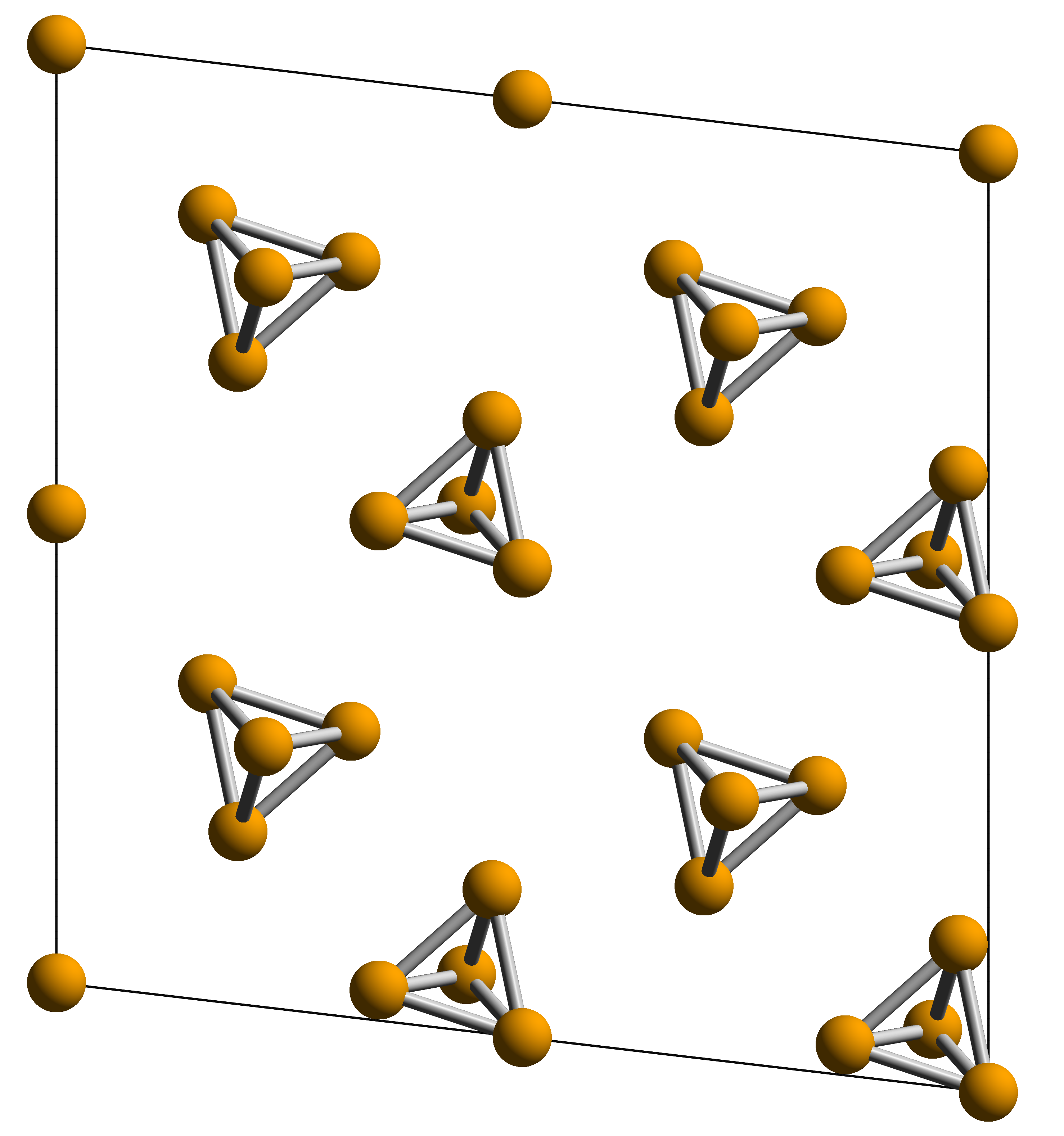 195.2 K에서 α 형태가 변환되어 생성되는 육방정계 결정 구조이다.[18] β 형태는 α 형태보다 반응성이 약간 작다.[19] 백린의 β 형태는 세 가지 약간 다른 분자, 즉 18개의 서로 다른 P-P 결합 길이(2.1768(5) Å와 2.1920(5) Å 사이)를 포함한다. 평균 P-P 결합 길이는 2.183(5) Å이다.[8]2. 2. 분자 구조
