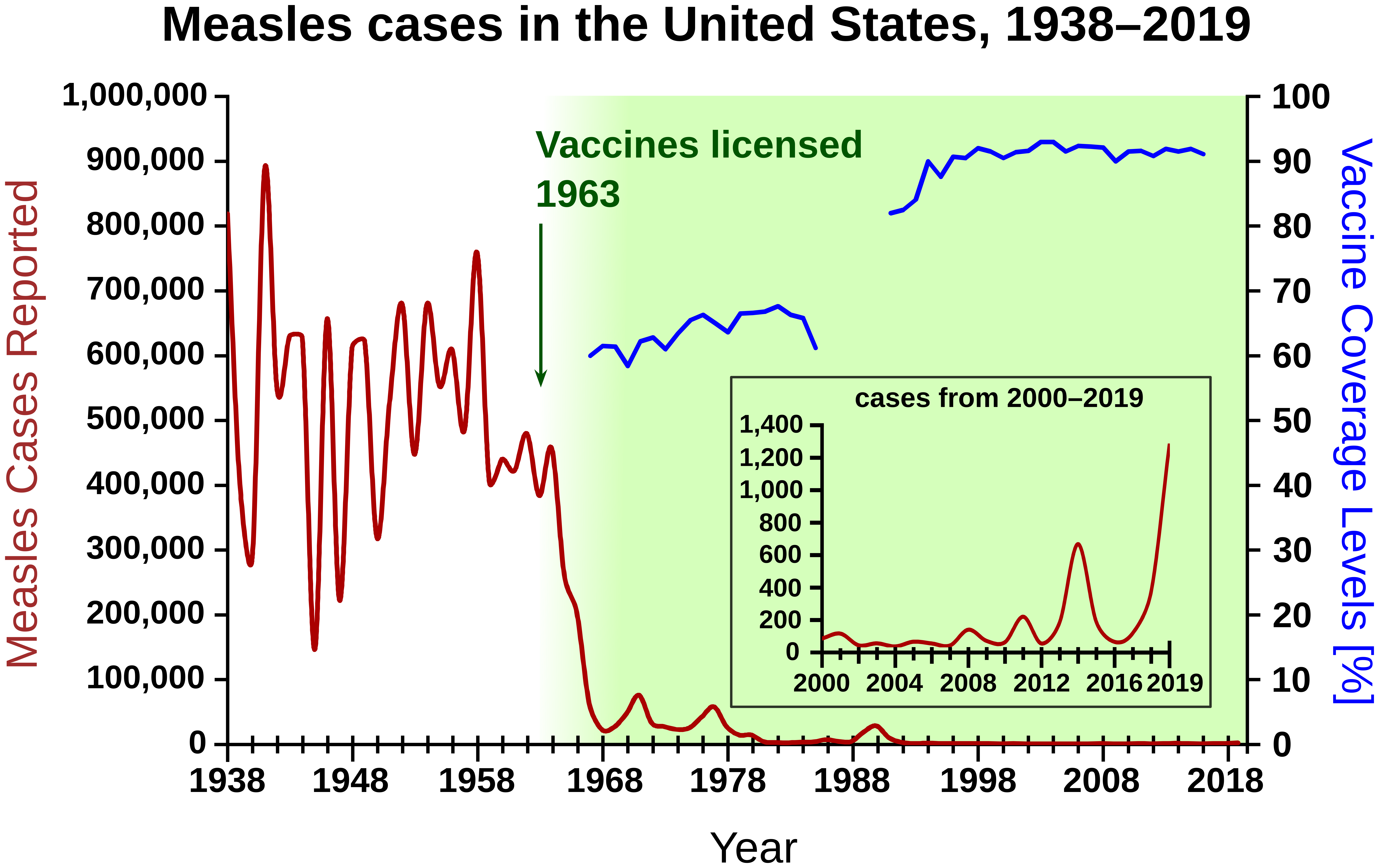 대규모 예방 접종 캠페인의 효과는 여러 과학적 증거를 통해 충분히 입증되었다.[30] 백신 접종은 매년 전 세계적으로 200만에서 300만 명의 사망을 예방하며, 모든 권장 백신을 사용할 경우 연간 150만 명의 추가 사망을 예방할 수 있다.[31] 예방 접종은 한때 유럽에서 어린이 7명 중 1명의 목숨을 앗아갈 정도로 치명적이었던 천연두를 근절하고, 소아마비를 거의 근절하는 데 기여했다.[33] 헤모필루스 인플루엔자(Hib) 감염은 1988년 백신 도입 이후 미국에서 99% 이상 감소했는데, 이는 어린이 세균성 수막염 및 기타 심각한 질병의 주요 원인이었다.[34] 미국에서 특정 연도에 태어난 모든 어린이가 출생부터 청소년기까지 완전한 예방 접종을 받으면 33,000명의 생명을 구하고 1,400만 건의 감염을 예방할 수 있다고 추산된다.[35]