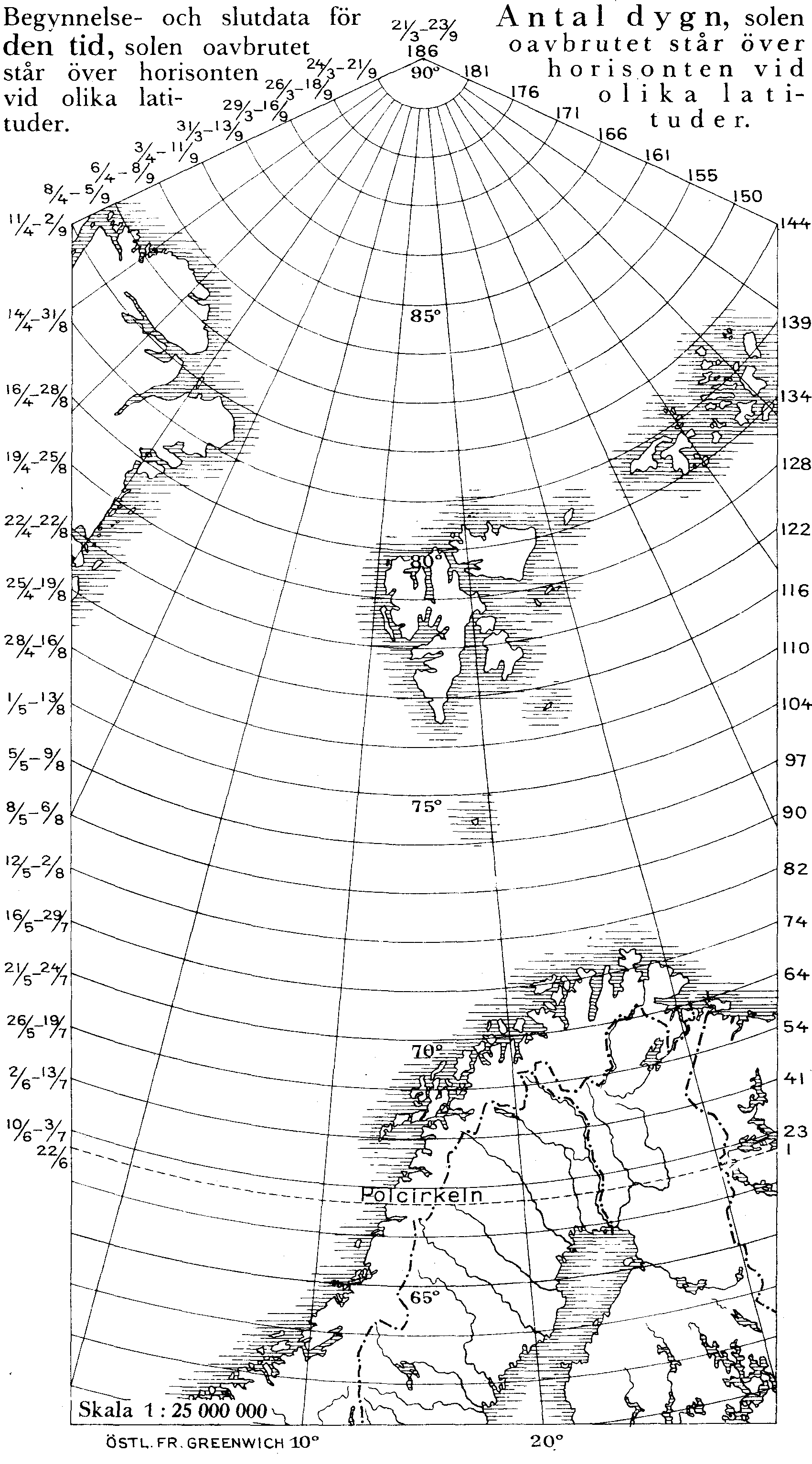 예를 들어, 노르웨이 노르웨이 북부에서 6월 21/22일 자정에 경도 25.9도는 시계 시간으로 103.2분 빨라지게 한다. 그러나 여름에 GMT보다 2시간 앞선 현지 시간은 시계 시간으로 120분 늦어진다. 해당 날짜의 균시차는 -2.0분이다. 따라서 태양의 고도는 자정에서 120 - 103.2 + 2.0분 후에 발생한다: 중앙 유럽 여름 시간으로 00시 19분. 다른 인근 날짜에는 균시차만 다르므로 이는 상당 기간 동안 합리적인 추정치로 남아 있다. 태양의 고도는 이 시간의 양쪽으로 약 45분 동안 최솟값인 약 5도 이내로 유지된다.[7]