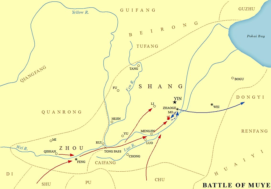 한편, 주 씨족의 지도자인 주 문왕은 상나라를 자신의 씨족(이후의 주나라)의 통치로 대체할 준비를 하고 있었지만, 당시에는 상나라의 제후국이었다. 상나라와는 대조적으로 주나라의 지도부는 농업 기술 발전에 힘입어 백성들에게 식량과 보호를 제공하는 것으로 유명했다.