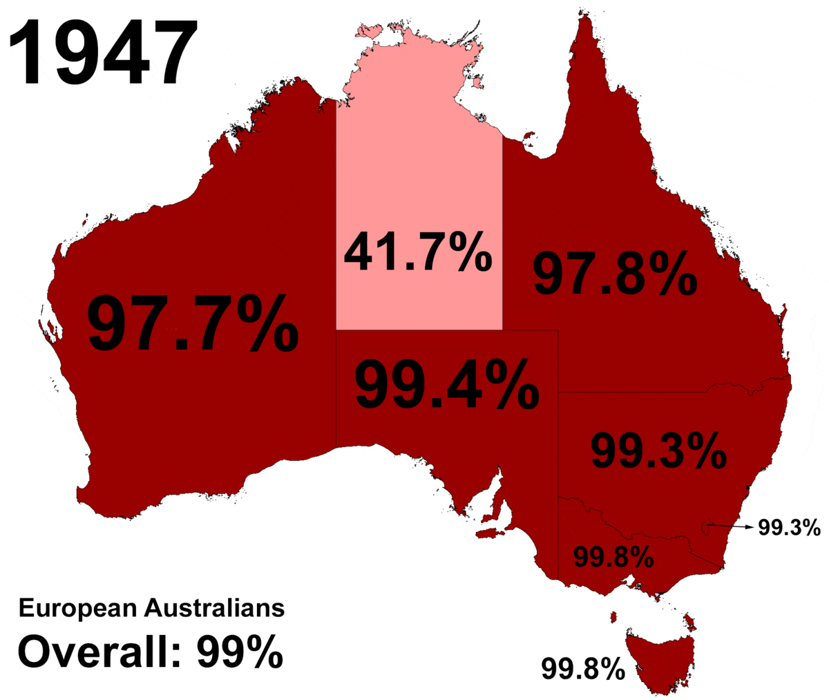 2021년 호주 인구 조사에서는 인종 분류에 "백인"이라는 용어를 사용하지 않았으므로, 결과는 인구의 54.7%가 유럽계 혈통임을 나타낸다.[67]