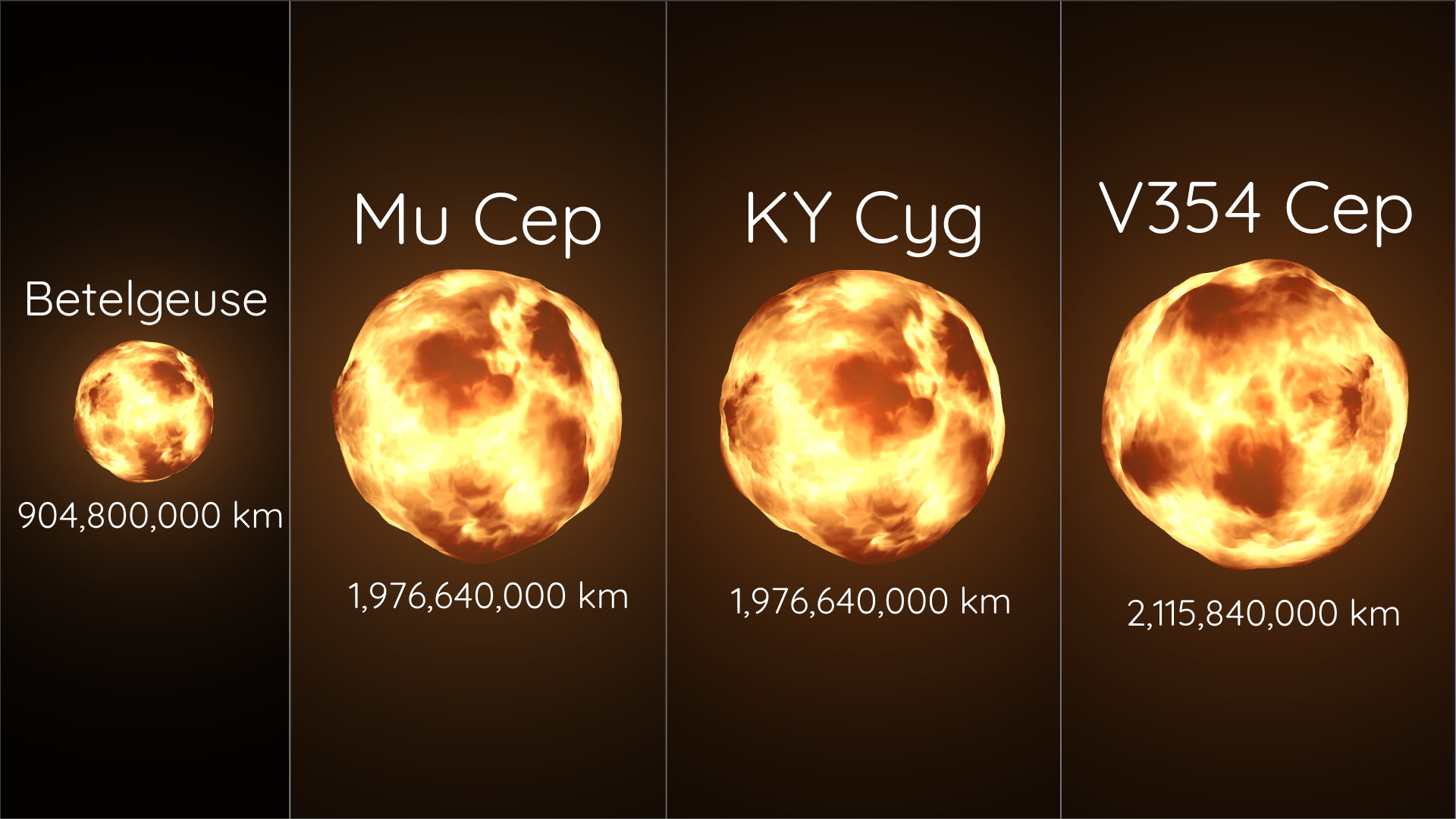2005년에 추정된 베텔게우스, 세페우스자리 뮤, 백조자리 KY, 세페우스자리 V354의 크기 비교