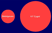 베텔게우스(왼쪽)와 비교한 백조자리 KY(오른쪽)의 크기.
