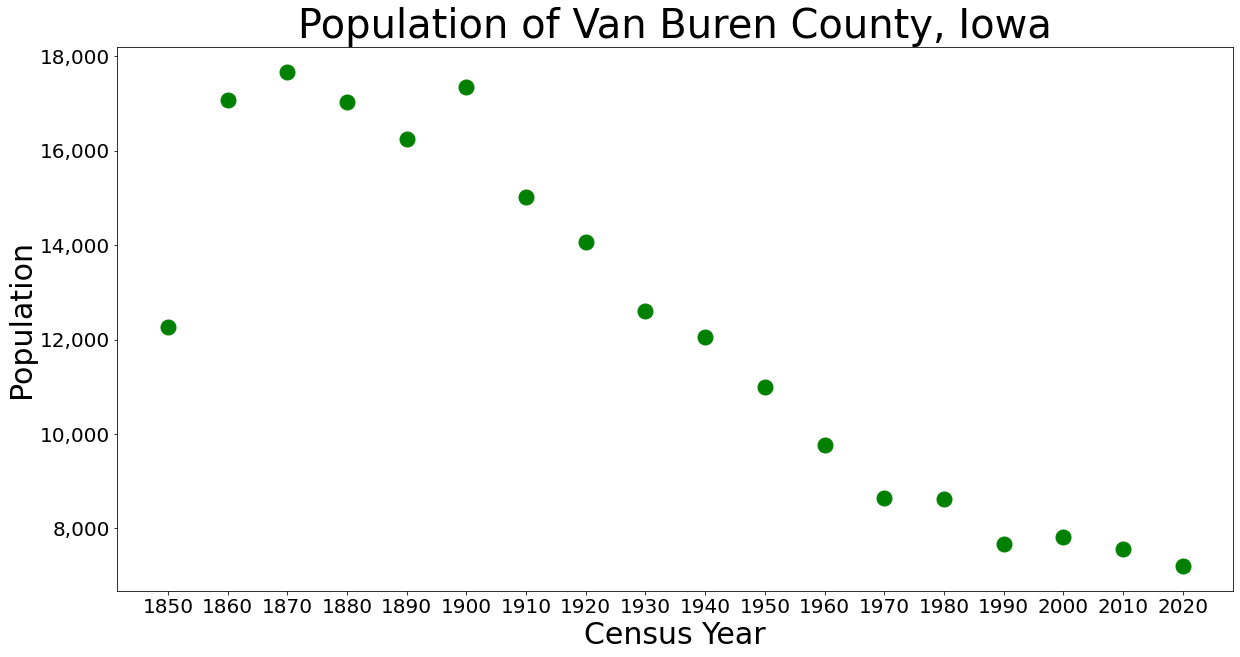밴 뷰런 군은 1836년 아이오와주 데모인 군에서 분리되어 설립되었으며, 마틴 밴 뷰런 대통령의 이름을 따서 명명되었다. 이 군은 아이오와주에서 가장 오래된 법원이 있는 곳으로, "꿀 전쟁"으로 알려진 미주리주와의 경계 분쟁의 배경이 되기도 했다. 밴 뷰런 군은 총 면적이 1,270 km²이며, 인구는 2020년 기준 7,203명이다. 역사적으로 공화당 지지 성향을 보였으나, 최근 선거에서는 변화를 겪었다. 교육구로는 카디널 커뮤니티 교육구, 데이비스 카운티 커뮤니티 교육구 등이 있다.