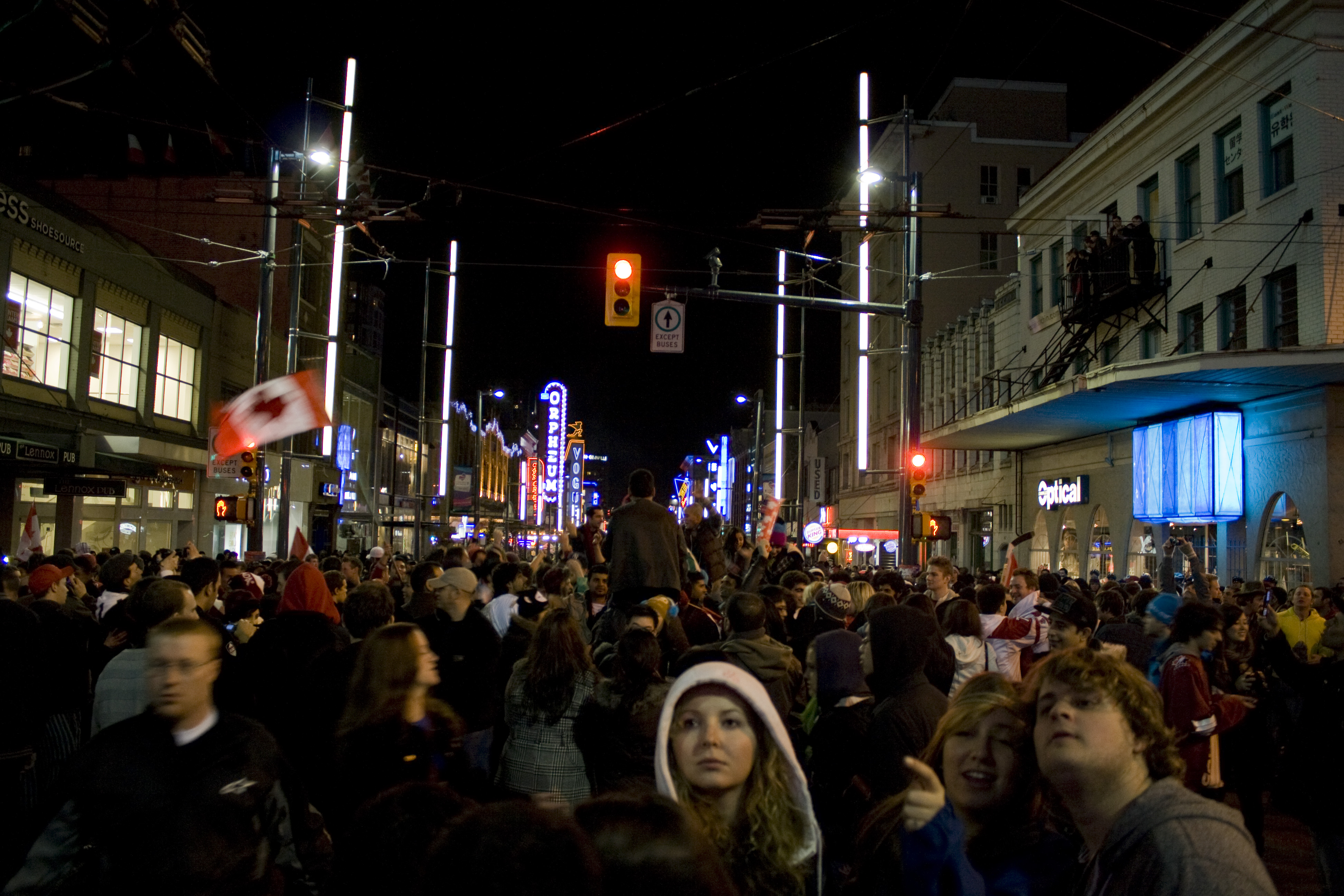 사복 RCMP 경찰관들이 1938년 구호 캠프 노동자 연합(Relief Camp Workers' Union) 시위대를 공격하는 모습. 대공황(The Great Depression) 기간 동안 도시에서는 실업 문제와 관련된 여러 시위가 발생했다.