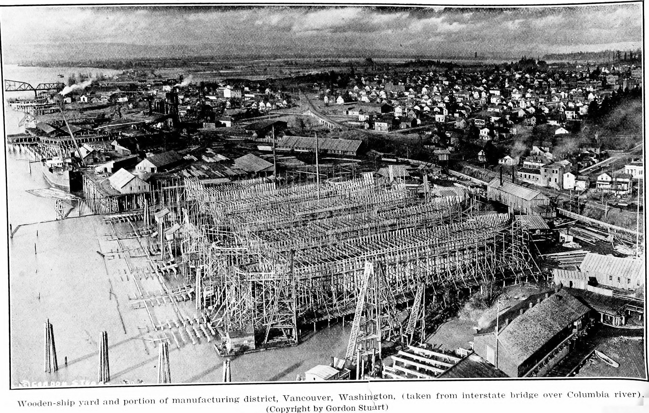 밴쿠버는 오리건주와 다리가 연결되기 전까지 조선업이 발달했습니다. 제1차 세계 대전 중에는 배를 생산했으며, 제2차 세계 대전 시기에는 알코아 알루미늄 공장과 헨리 카이저의 조선소가 들어서면서 경제 호황을 맞았습니다. 카이저 조선소에서는 리버티 선박, 상륙함, 호위항공모함 등을 생산하며 3만 6천 명을 고용했고, 이로 인해 인구가 급증했습니다.