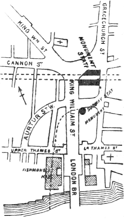 1888년 지도에 표시된 뱅크·모뉴먼트역. 건설 중이던 C&SLR의 킹 윌리엄 스트리트역도 표시되어 있다.