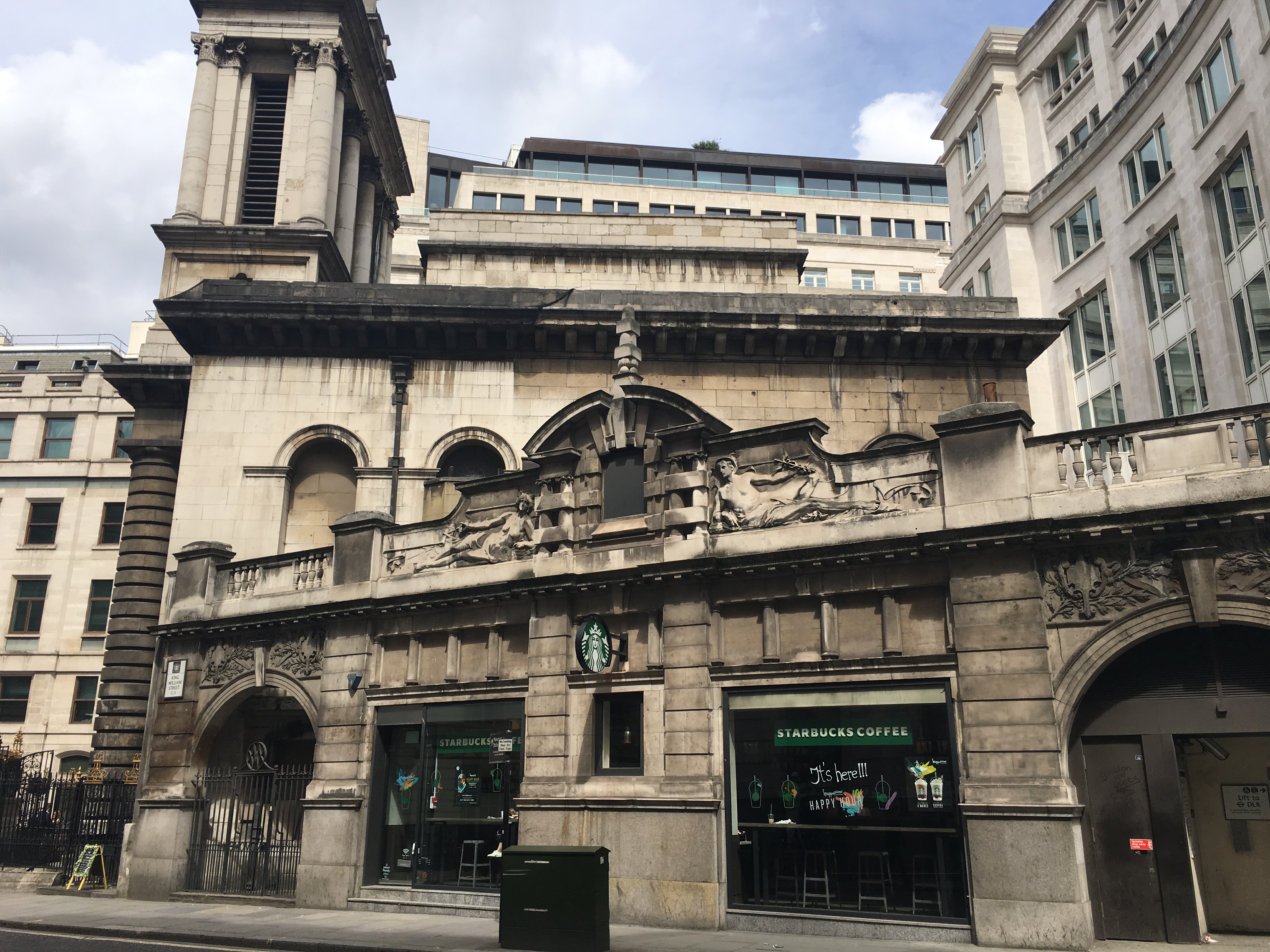 이전 C&SLR 역의 입구, 현재는 스타벅스 지점이며, 뒤에는 세인트 메리 울노스 교회가 있다.