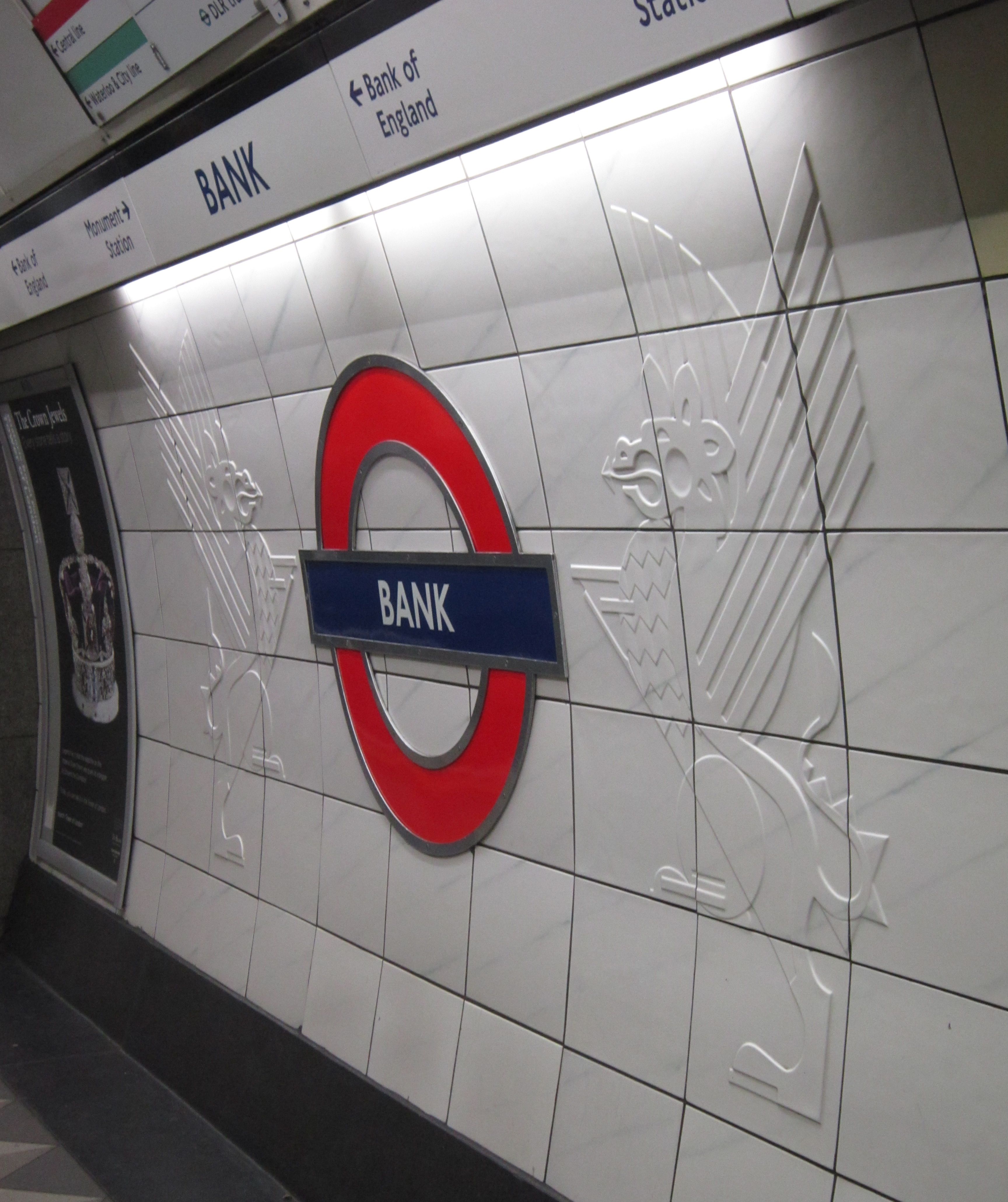 역의 벽 타일에는 런던 시의 문장 지지자와 지하철 라운델이 결합되어 표시되어 있다.