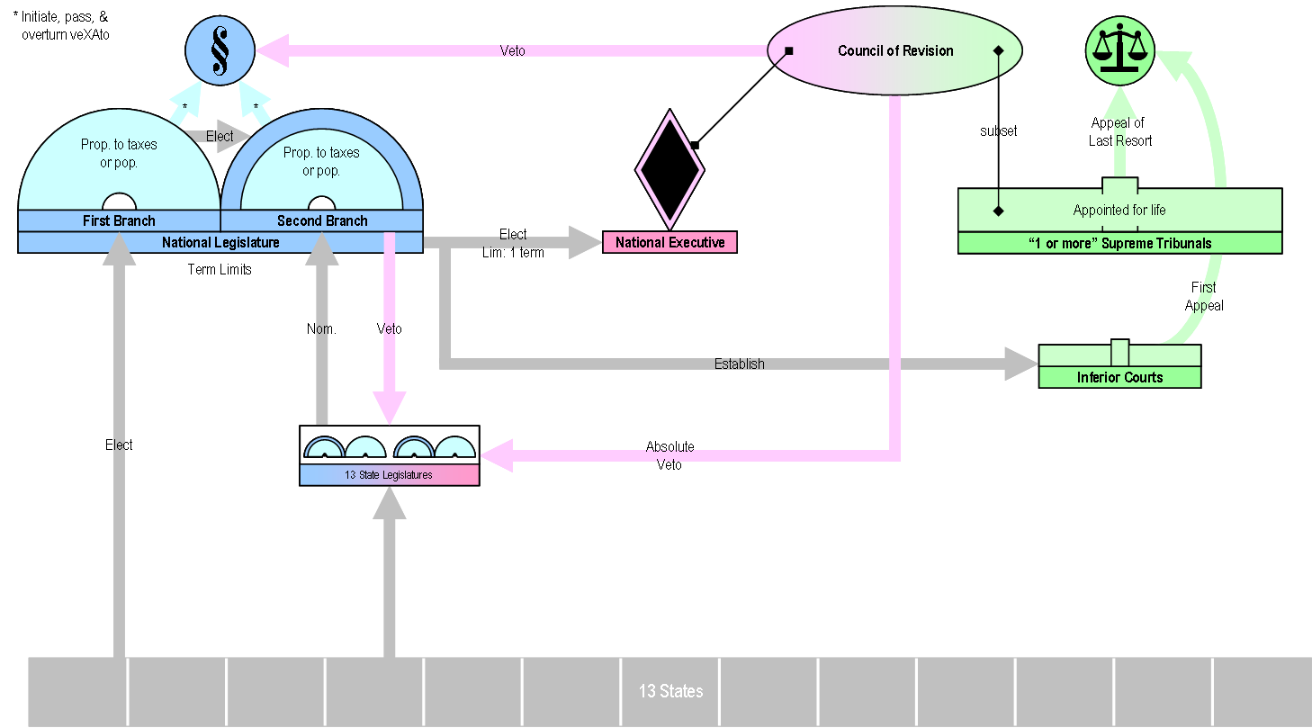 버지니아 안은 행정부와 "적절한 수"의 판사로 구성된 개정 위원회를 제안했다. 이 위원회는 국가 또는 주 입법부의 모든 행위에 대해 거부권을 행사할 수 있었으며,[3] 이 거부권은 국가 입법부의 불특정 다수결 투표로 무효화될 수 있었다.[3]3. 6. 기타