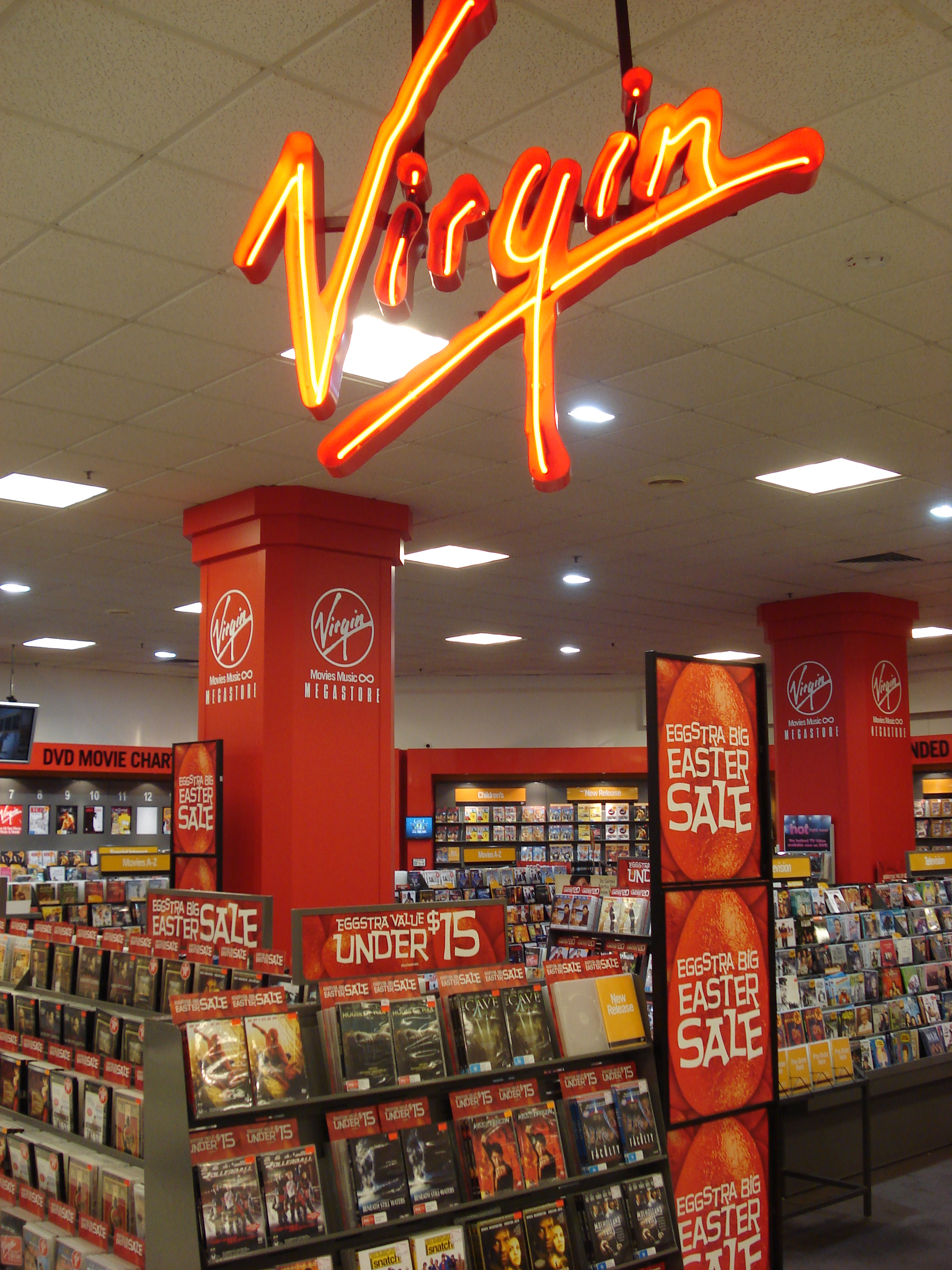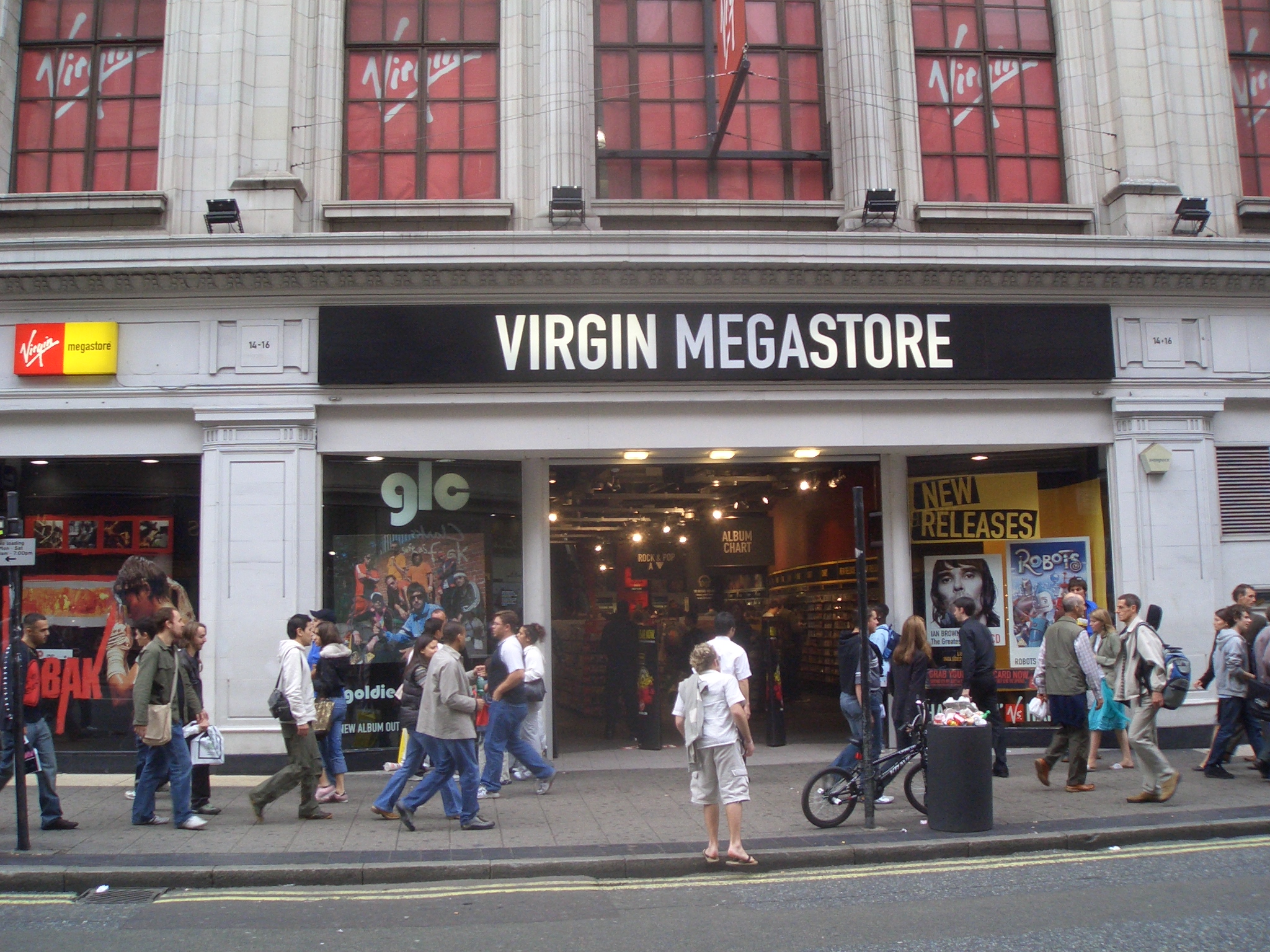버진 레코드는 원래 통신 판매 전문 레코드 레이블이었으나, 우체국 직원의 파업으로 인해 영업을 할 수 없게 되자 리처드 브랜슨이 런던에 설립한 음반 가게였다.[137] 이후 유럽, 북미, 일본, 오스트레일리아 등으로 세계적으로 확장했지만, 인터넷 통신 판매 및 다운로드 판매 등 전자 상거래의 확대로 인해 실적이 악화되었다.