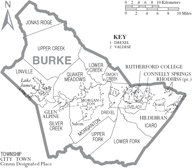 이후 유럽인들의 본격적인 정착은 시간이 흐른 뒤 이루어졌다. 1777년 미국 독립 전쟁 중에 버크군은 로언 카운티에서 분리되어 공식적으로 설립되었으며, 군의 이름은 당시 대륙 회의 대표이자 후에 노스캐롤라이나 주지사를 역임한 토마스 버크를 기리기 위해 명명되었다. 18세기 중후반에는 많은 스코틀랜드-아일랜드계 미국인과 독일계 이민자들이 서부 피드몬트 지역에 정착했으며, 이들은 주로 자립적인 요먼 농부였다.