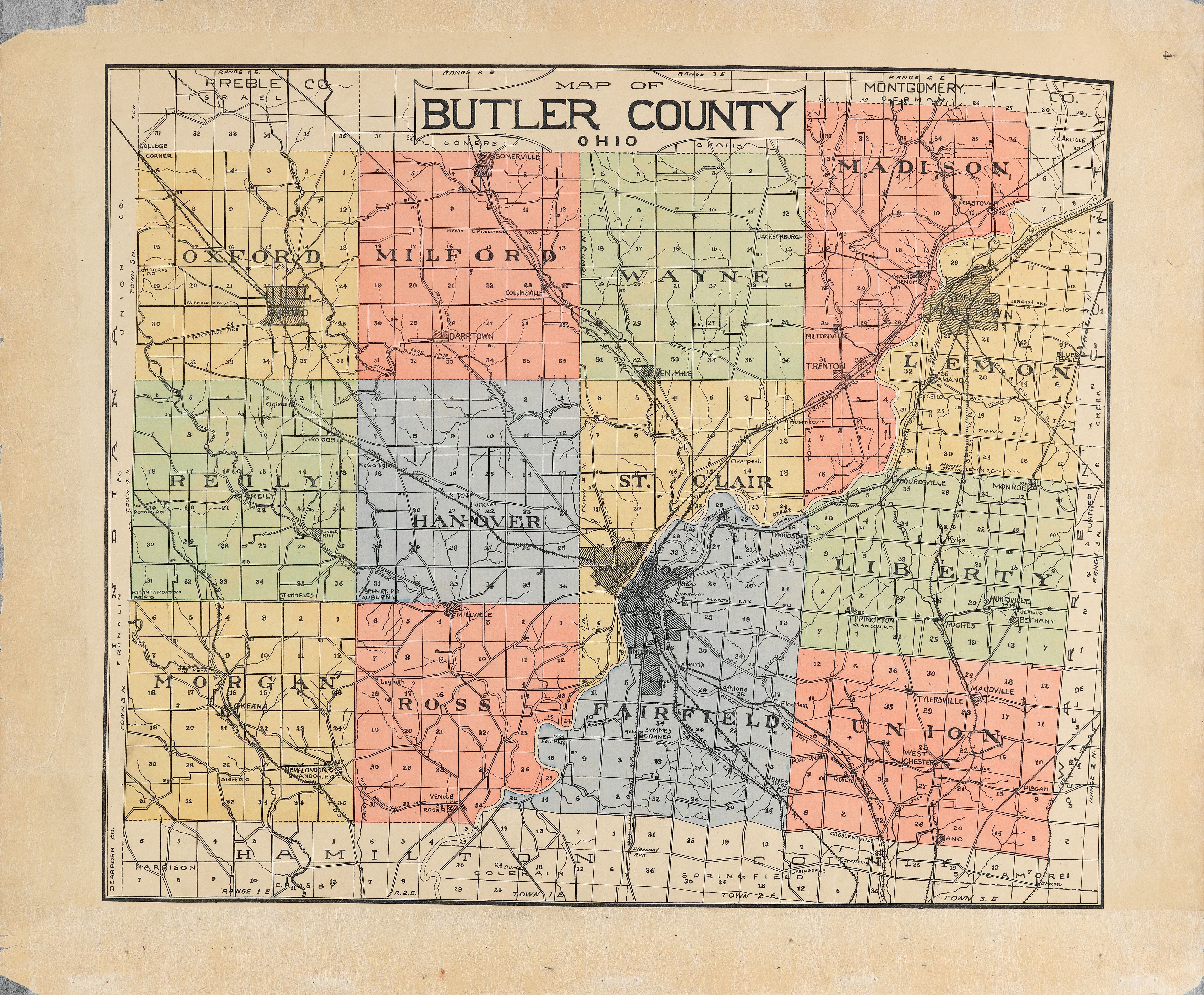 1913년 대홍수는 이 군의 많은 지역, 특히 약 25%가 침수되고 6명이 사망한 오하이오주 미들타운과 도시의 46%가 침수되고 300채 이상의 건물이 파괴되었으며 최소 98명이 사망한 오하이오주 해밀턴 지역에 영향을 미쳤다.[9]