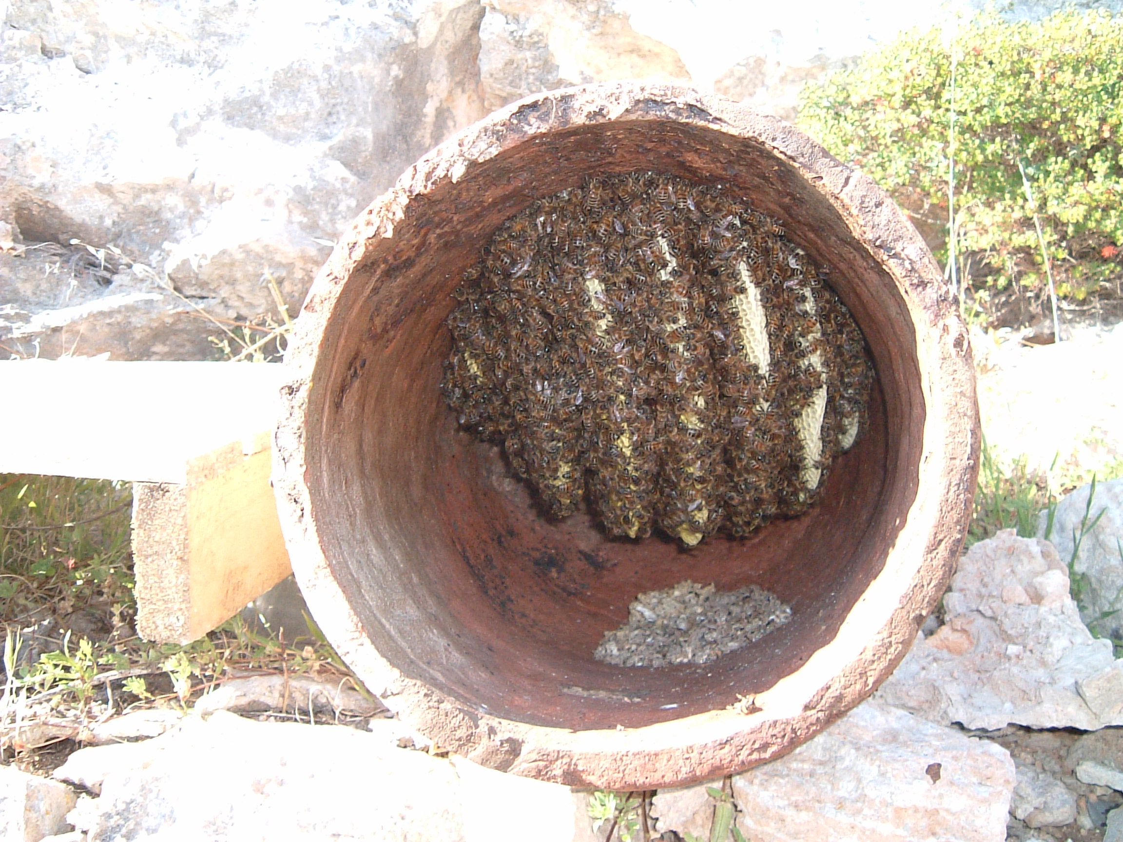 달가번 밀에 있는 벌통. 바닥은 오래된 치즈 프레스의 일부이다.
