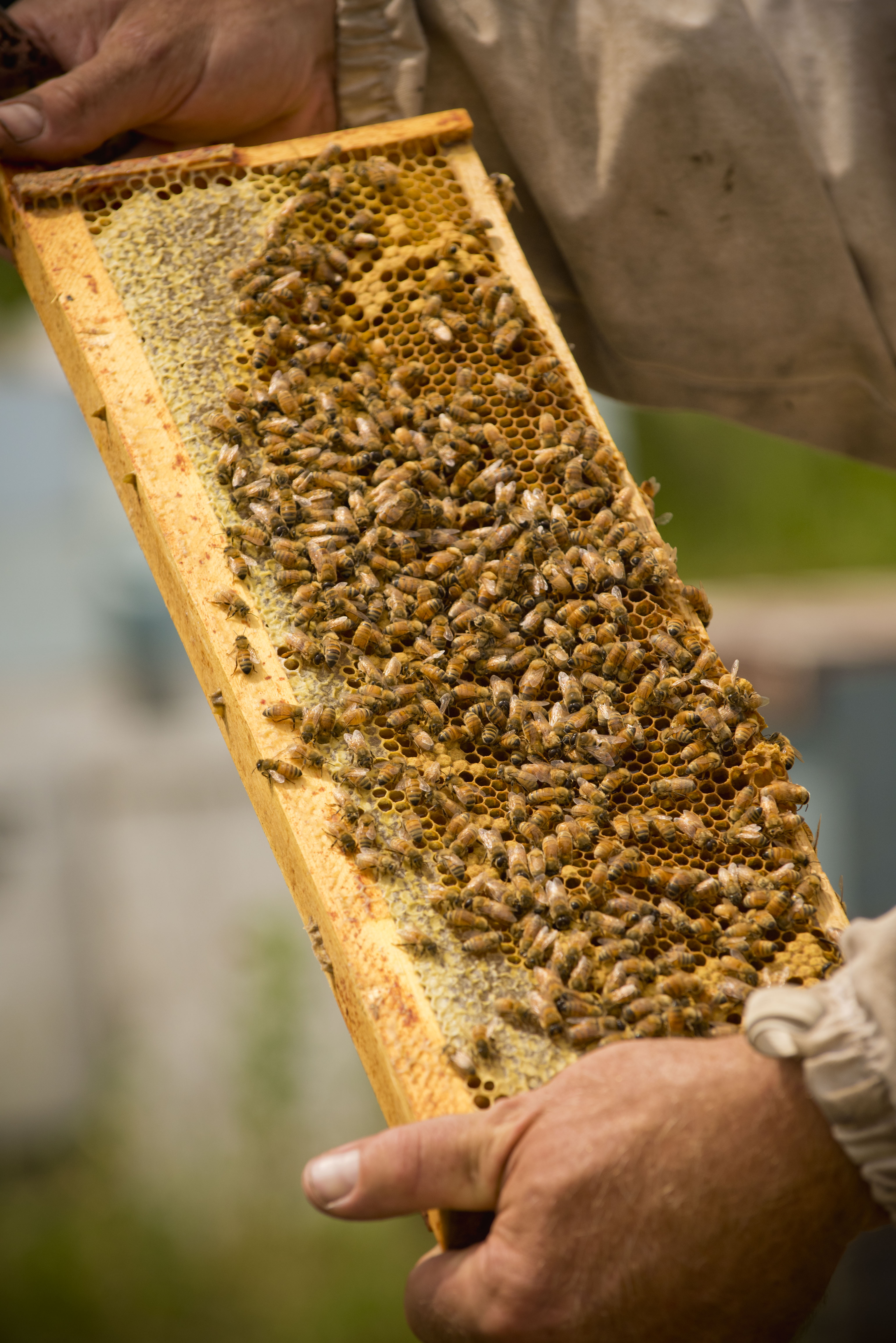 벌통지기(양봉가)가 벌집 틀을 검사하고 있으며, 덮인 꿀과 애벌레 방을 보여주는 벌집이 있다. 모듈식 디자인은 더 쉬운 관리와 꿀과 밀랍의 비파괴적 수확을 가능하게 한다.