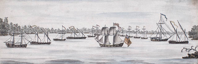 발쿠르 섬 전투에서 지중해 갤리와 기능은 유사하지만 설계가 매우 다른 여러 "노 갤리"를 묘사한 미국 선박; 찰스 랜드(Charles Randle)의 수채화