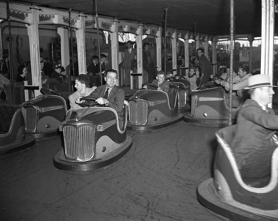 1920년대 초, 맥스 스퇴러와 그의 아들 해럴드는 그들의 닷지엠(Dodgem) 자동차의 기반이 된 "놀이 기구"에 대한 특허를 받았다. 그들은 의도적으로 이 장치에 "조작과 제어를 어렵고 불확실하게 만드는 새로운 도구"를 장착했다. "숙련되지 않은 조작자"가 "다수의 독립적으로 조작된 ... 자동차"를 운전하면, "바닥이나 다른 지역에서 무작위적이고 불규칙하며 정의되지 않은 경로를 따라 이동하여 차량이 이동하는 동안 다양한 감각을 유발할 뿐만 아니라 다른 자동차 및 해당 목적을 위해 제공된 플랫폼의 일부와 충돌"할 것이라고 그들은 주장했다.[7]1920년대 후반부터 1950년대까지 전성기 동안, 미국의 두 주요 범퍼카 브랜드는 스퇴러의 닷지엠과 조셉 및 로버트 '레이' 루세 형제(Lusse Brothers)의 오토-스키터(Auto-Skooter)였다.[8][9] 루세 형제는 1959년에 최초로 유리 섬유 차체를 제작했는데, 이는 이전 6년 동안 쉐보레 콜벳 차체가 살아남은 것에 부분적으로 기인한다. 쉐보레의 허가를 받은 후, 필라델피아 지역 딜러로부터 실제 콜벳 쉐브론을 구매하여 1959년 그들의 제품 코에 부착했다.