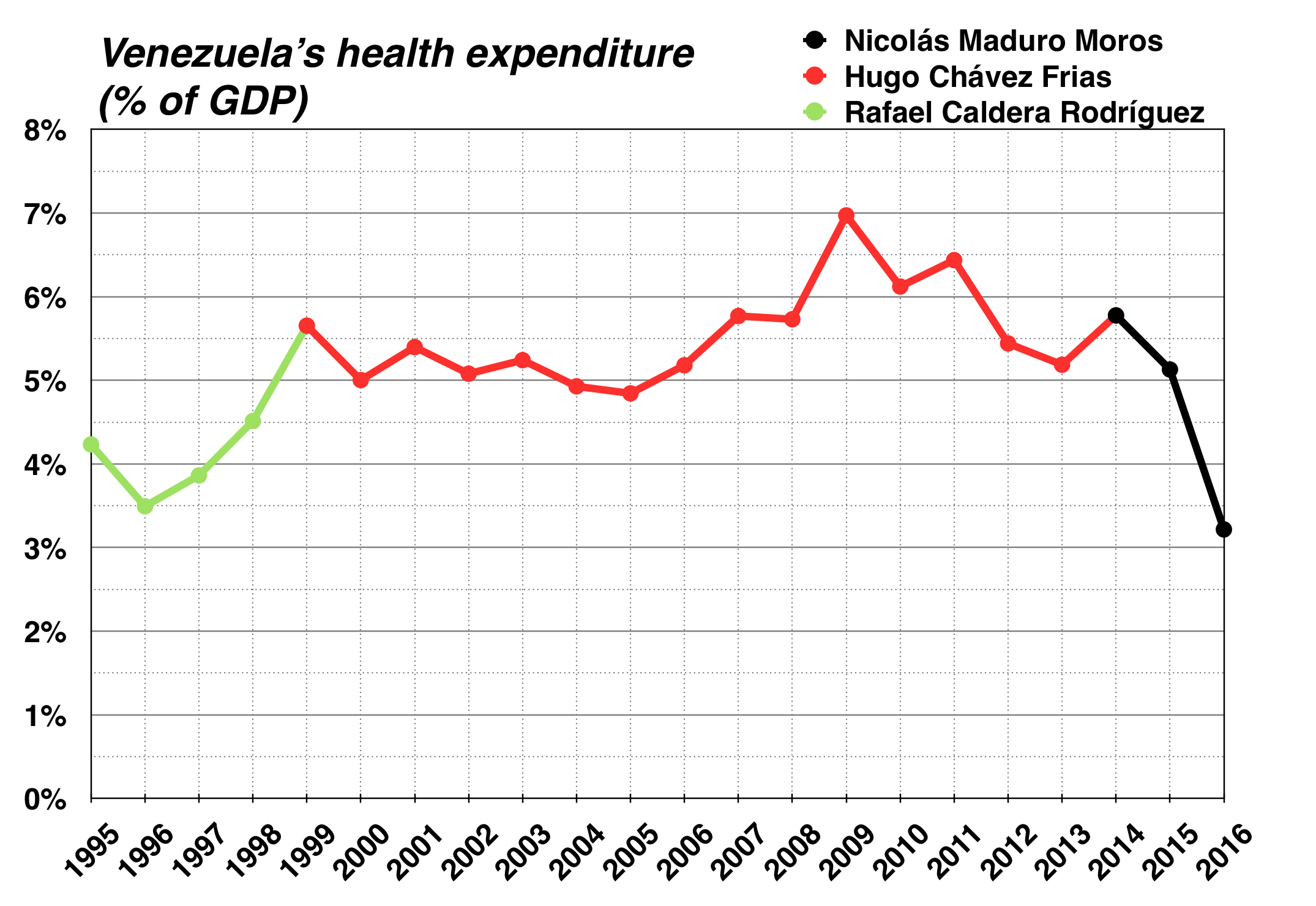 베네수엘라의 수입품 의존과 차베스 시대에 시작된 복잡한 환율 체제는 2000년대 후반부터 2010년대까지 의약품과 의료 장비 부족 사태를 초래했다.[175] AP 통신에 따르면 정부는 2010년부터 의료 통계 발표를 중단했다.[176] 차베스 대통령 재임 기간 동안 보건부 장관은 여러 차례 바뀌었다. 베네수엘라 보건부 고위 관계자에 따르면, 공중 보건 문제가 발생할 때마다 장관들이 희생양이 되었으며, 보건부 관리들이 공중 보건용 물품을 다른 사람들에게 판매하여 부를 축적하는 부패 행위에 가담했다고 한다.[175]