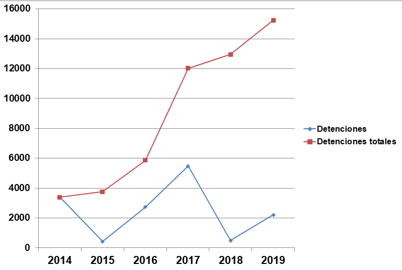 2019년에는 탄압과 정치적 동기의 구금이 기록적으로 증가했다.[272] 포로 페날(Foro Penal)은 2019년 4월 기준으로 베네수엘라에 최소 900명의 정치범이 있으며, 더 많은 사람들이 열악한 환경에서 장기간 구금되고 모호한 혐의로 체포되고 있다고 밝혔다. 이 인권 단체는 "성적 학대, 비닐봉투를 이용한 교살, 면도날로 수감자의 발을 자르는 행위"를 포함한 50건 이상의 사례를 기록했다.[52] 포로 페날은 2019년 첫 3개월 동안 1,712명이 체포되었고, 그중 약 3분의 2가 정치범으로 분류되는 기준인 48시간 이상 구금되었다고 밝혔다.[52] 마두로 대통령은 체포된 사람들을 "테러 집단" 구성원이라고 부르며 정부가 그들을 감옥에 보내는 것을 주저하지 않을 것이라고 말했다. 변호사에 따르면 후안 레케센스(Juan Requesens)와 로베르토 마레로(Roberto Marrero)는 "순전히 정치적인" 체포의 예이다.[52] 점점 더 많은 수감자들이 위기에 몰려 시위에 나선 노동계급 사람들이다.