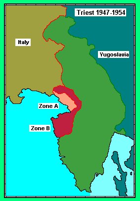 1954년, 이탈리아와 유고슬라비아가 런던에서 맺은 협정에 의해, 트리에스테 자유 지구 북부(A 지구)에서의 이탈리아, 트리에스테 자유 지구 남부(B 지구)에서의 유고슬라비아의 시정권이 각각 상호 승인되었다. 1975년에 오지모 조약에 의해 A지구·B지구가 각각 이탈리아령·유고슬라비아령으로 확정되었다.[22]
