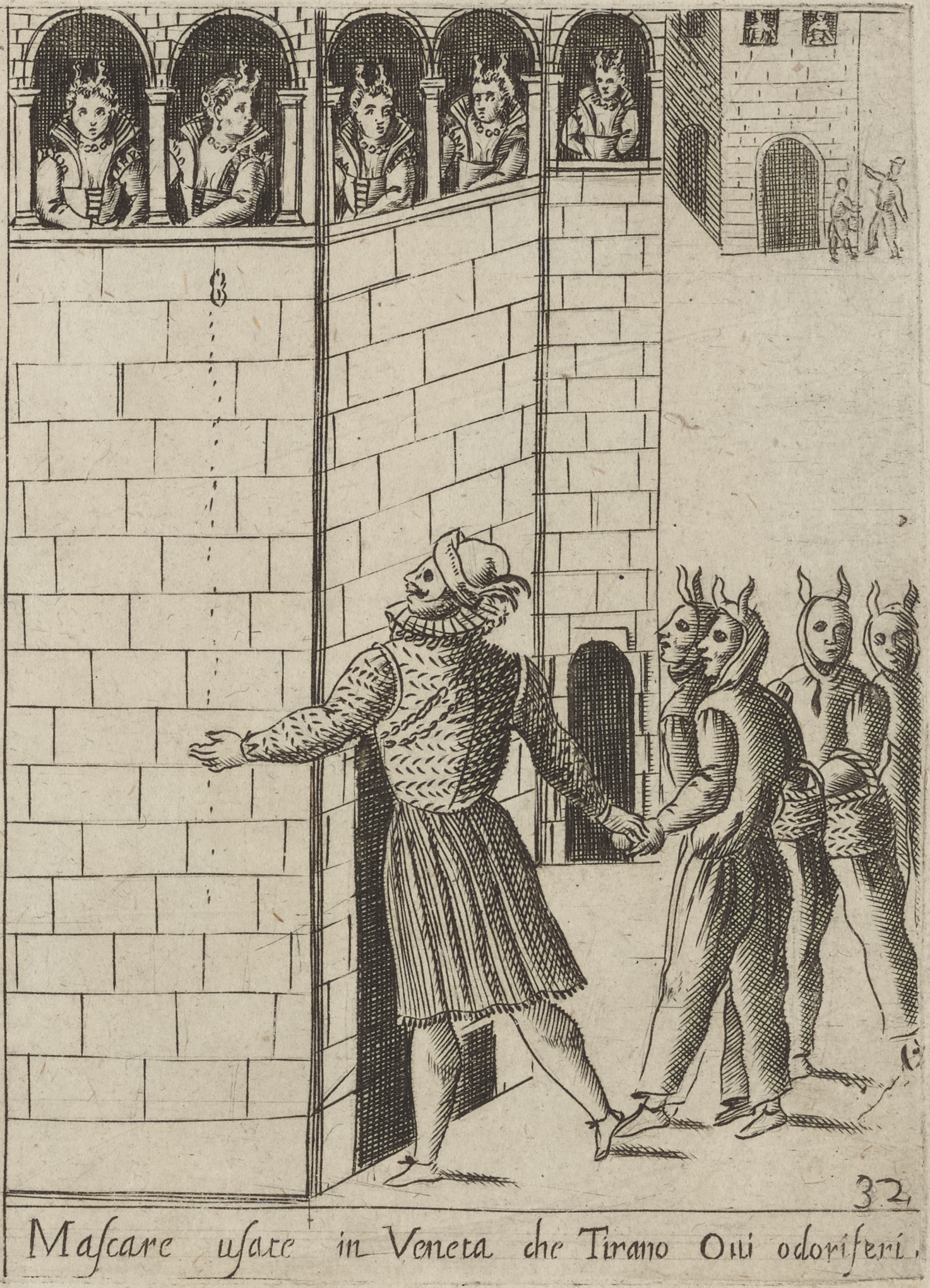 베네치아에서 가면 착용이 시작된 정확한 이유는 불분명하지만, 13세기 문헌에서 가면 사용에 대한 기록을 찾을 수 있다.[41] 한 학자는 가면 착용이 엄격한 계급 사회에 대한 베네치아 특유의 반응이라고 주장한다.[40] 1268년 법령은 가면을 쓴 남성이 여성에게 달걀을 던지는 행위를 금지했고,[41] 1339년 법은 가면을 쓰고 변장하여 수녀원을 방문하거나 얼굴을 칠하고 가짜 수염, 가발을 착용하는 것을 금지했다.[16]